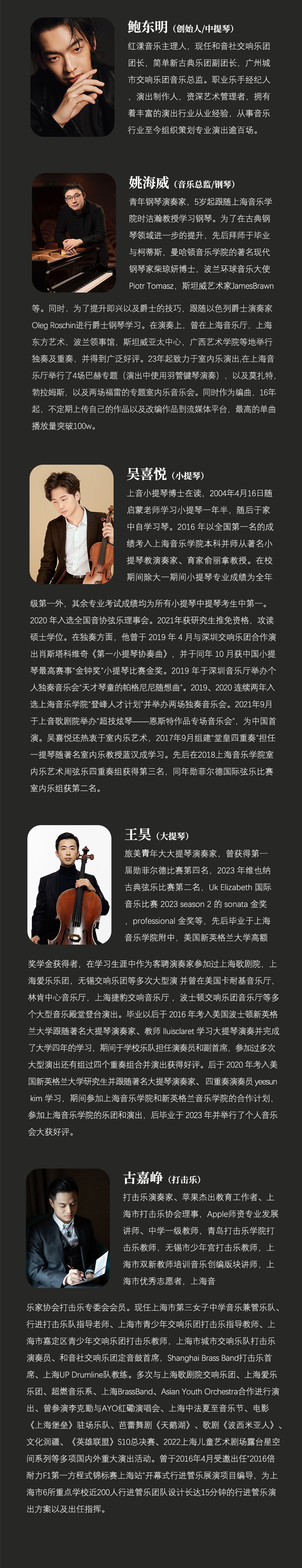 坂本龙一曲风多变,音乐配置极其丰富,本场音乐会特别邀请实力钢琴家、小提琴家、中提琴、大提琴、低音提琴演奏家为您献上这场音乐会。 让我们一起走进坂本龙一的音乐世界。
