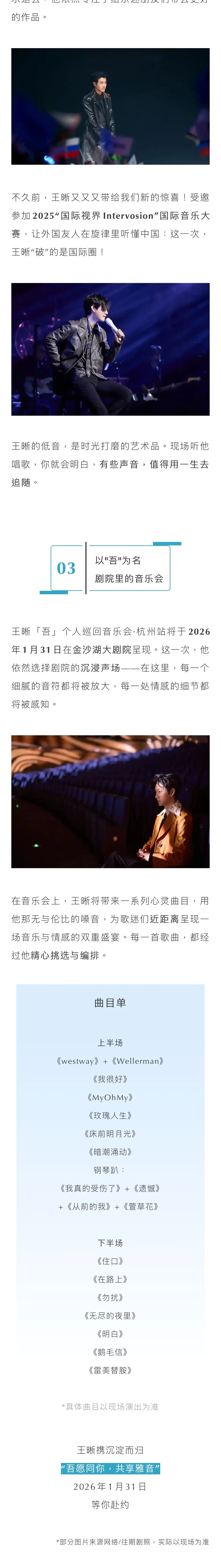 王晰的舞台表现力一如既往地令人赞叹。他擅长将歌曲的情感与自身的感悟融为一体,通过细腻入微的肢体语言和面部表情,将歌曲中的每一个细节都生动地传达给粉丝。在“吾”音乐会上,歌迷们将亲眼见证他如何用音乐讲述故事,用歌声触动心灵,共同创造一段难忘的音乐旅程。
