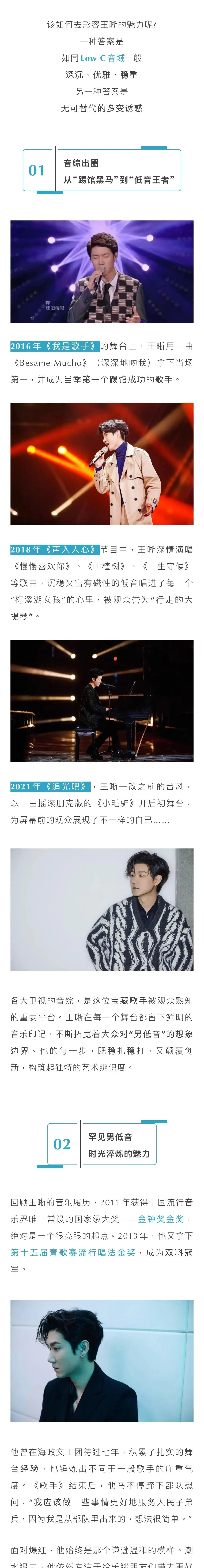 自出道伊始,王晰便以独特的流行低音唱腔与卓越的音乐才华,赢得了众多歌迷的青睐与高度赞誉。他不仅在音乐领域持续突破自我,更在舞台上展现出非凡的感染力。每一次演唱,都如同心灵深处的对话,传递着他对音乐的无限热爱与不懈追求。