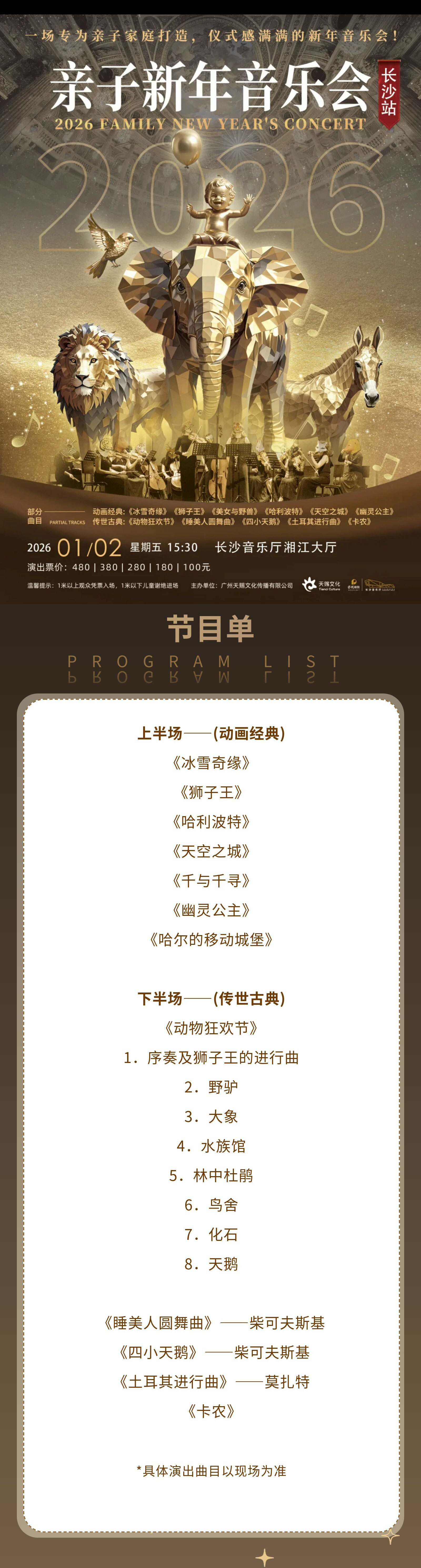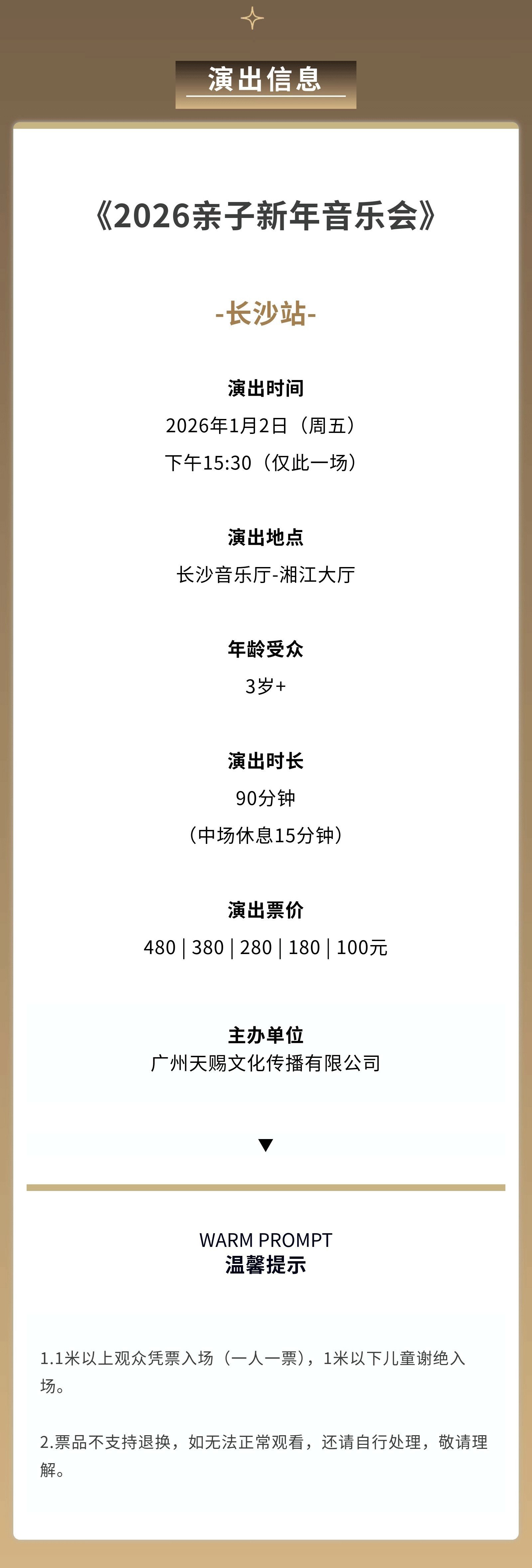 演出时间 2026-01-02 星期五 15:30 演出场馆 长沙音乐厅 演出时长 以现场为准 儿童入场提示 儿童一律凭成人票入场 演出详情