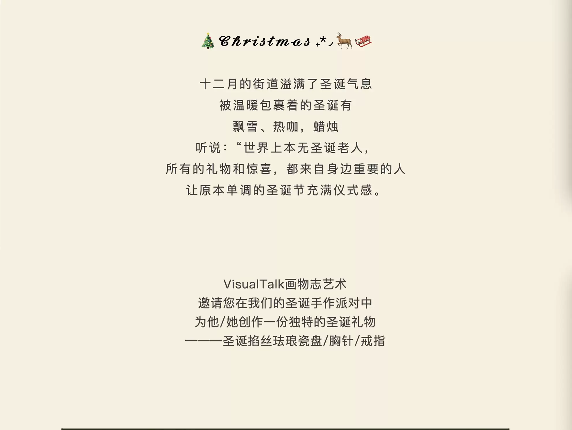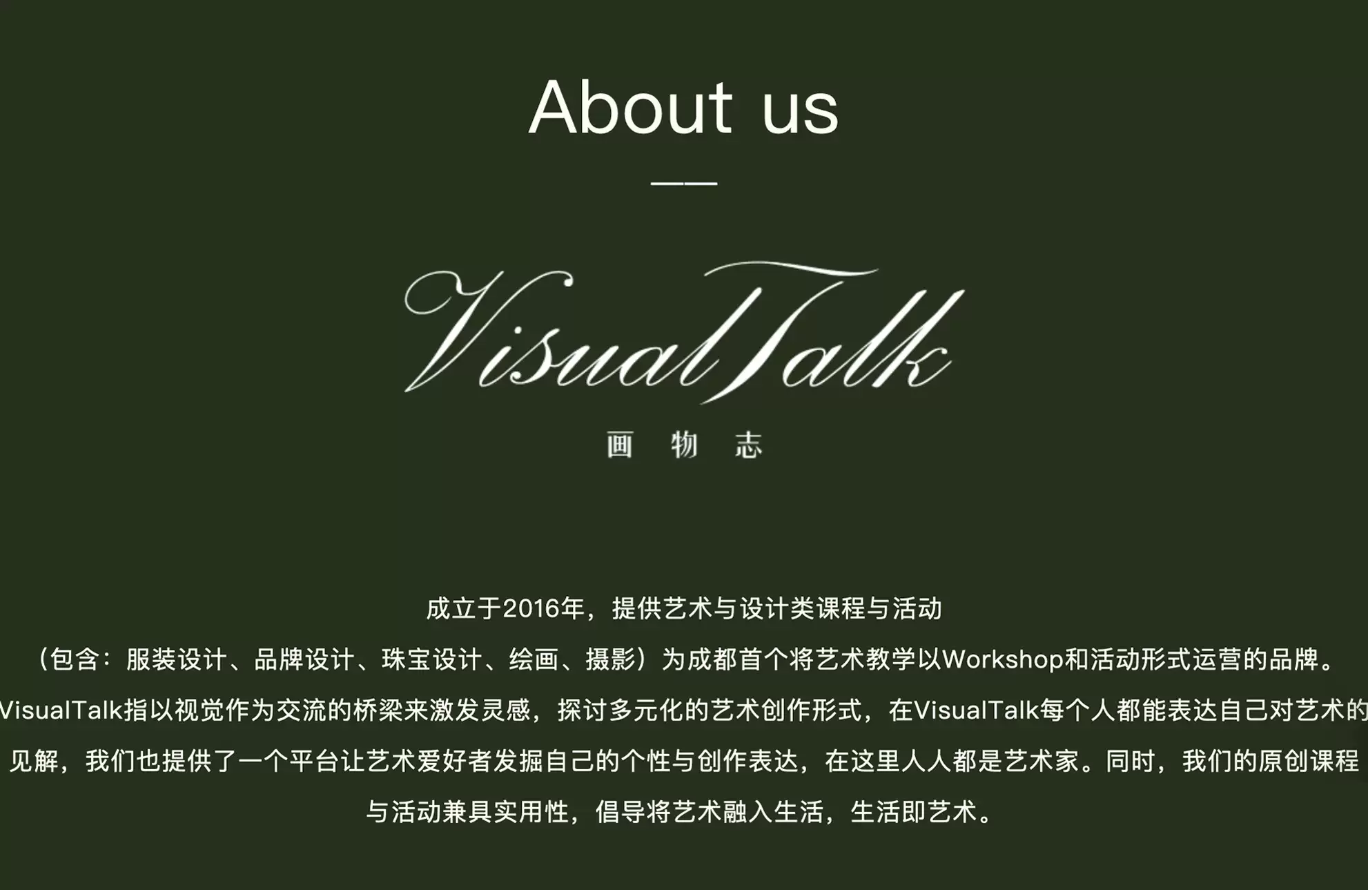 品牌介绍:VisualTalk指以视觉作为交流的桥梁来激发灵感,探讨多元化的艺术创作形式,在VisualTalk每个人都能表达自己对艺术的见解,我们也提供了一个平台让艺术爱好者发掘自己的个性与创作表达,在这里人人都是艺术家。同时,我们的课程与活动兼具实用性,倡导将艺术融入生活,艺术其实离生活很近。