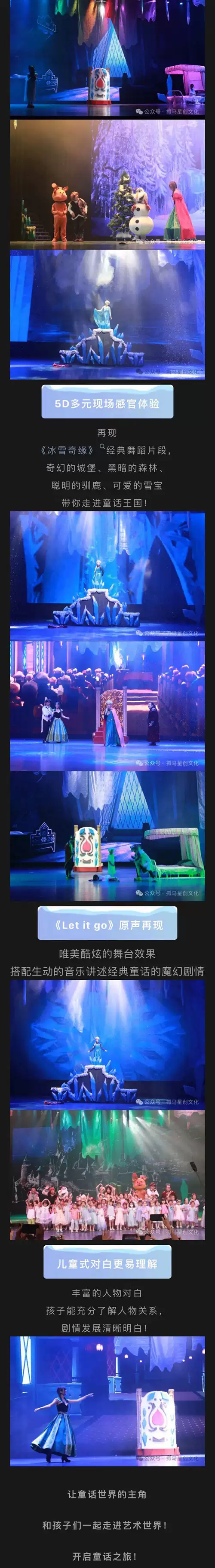 2.经典歌曲Let it go再现,现场好看也好听本场儿童剧再现电影中的经典音乐片段,全新创作活泼动人的儿童配乐,搭配优美的舞蹈,将王子公主的高雅气韵,要距离呈现在孩子们面前,现场好看又好听。