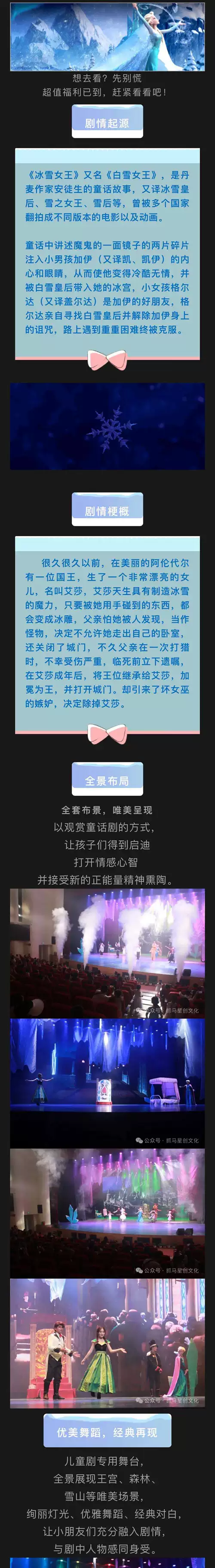 1.儿童剧版《冰雪女王》,遇见真实的安娜艾莎公主儿童剧《冰雪女王》还原电影经典情节,故事更加细腻动人,并且孩子们能够在现场遇见真实的安娜公主、艾莎公主、会说话的雪宝这些鲜活的电影角色。