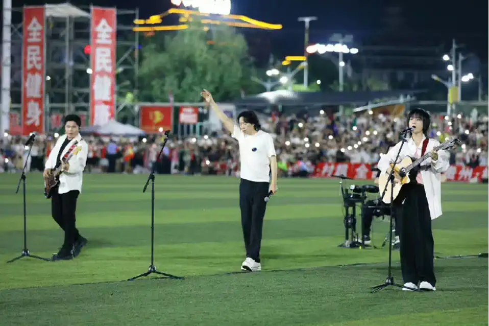 7月8日晚,水木年华现身贵州“村超”赛场,为球迷献唱助力“村超”。缪杰称,他们是作为拉拉队登场助唱。此前,榕江县聘缪杰为寨蒿镇晚寨村“名誉村长”,他通过电商助力黔货出山。当问及来到贵州“村超”后的感受时,水木年华表示应继续保持对足球的热爱。当万众瞩目和期待的水木年华激情献唱《在他乡》《启程》《一生有你》等经典曲目,让球场瞬间变成了演唱会现场。观众们打开手机电筒,星星点点的亮光照亮整个夜空!当音乐声响起万人大合唱,满满的回忆杀和氛围感直接拉满,让全国观众享受到了一场激情澎湃的视听盛宴。