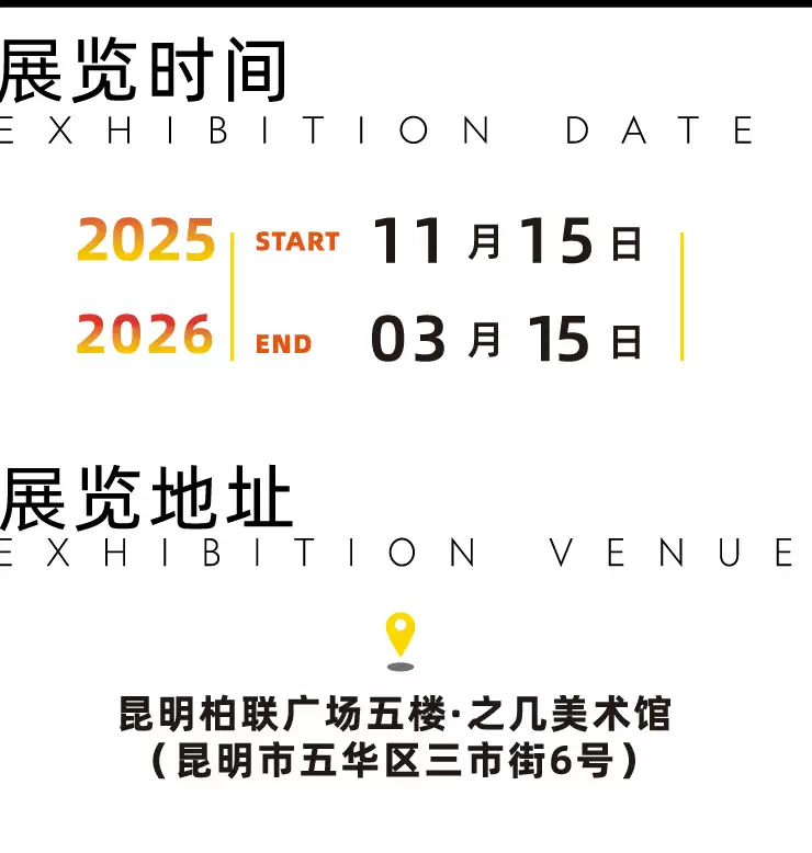 展览时间 2025.11.01-12.31 展览场馆 之几美术馆昆明柏联馆 展览时长 以现场为准 展览入场提示 儿童1米以下免票,需家长陪同观展,且一名家长最多只能携带一名免票儿童 演出详情