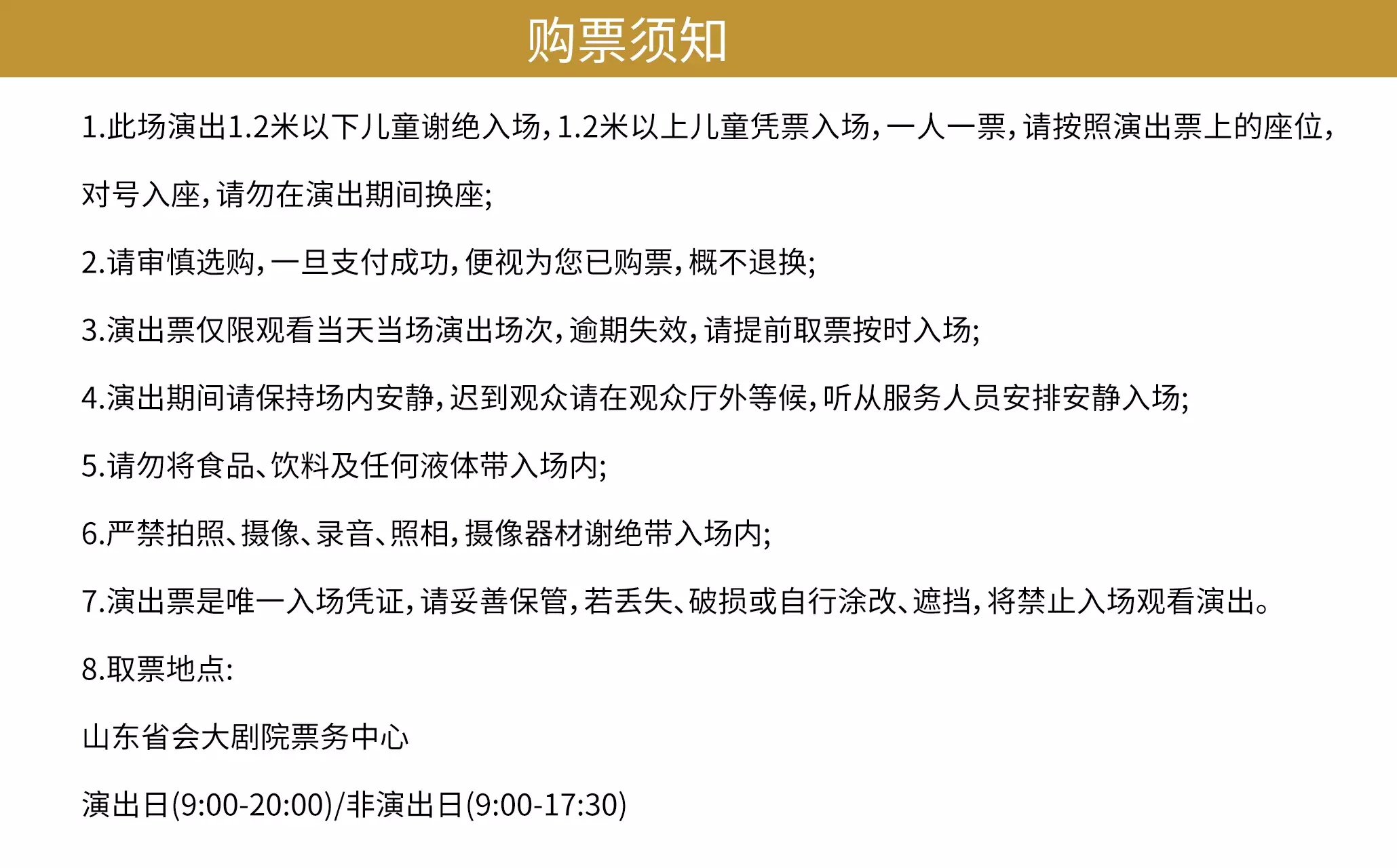 票品为有价证券,非普通商品,其背后承载的文化服务具有时效性、唯一性、稀缺性等特征,如非演出变更或不可抗力因素,一经支付,不退不换,敬请谅解!