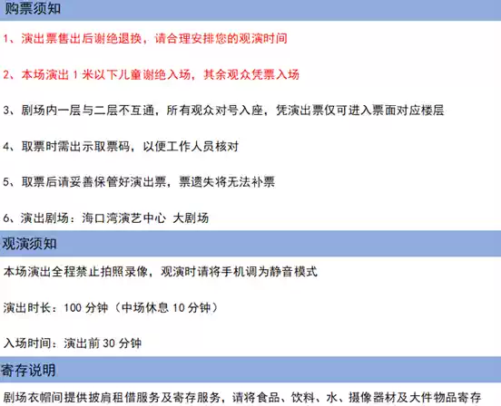 1.购买前请您提前规划好行程,做好相应准备,以免影响您的正常观演,感谢您的理解和配合。