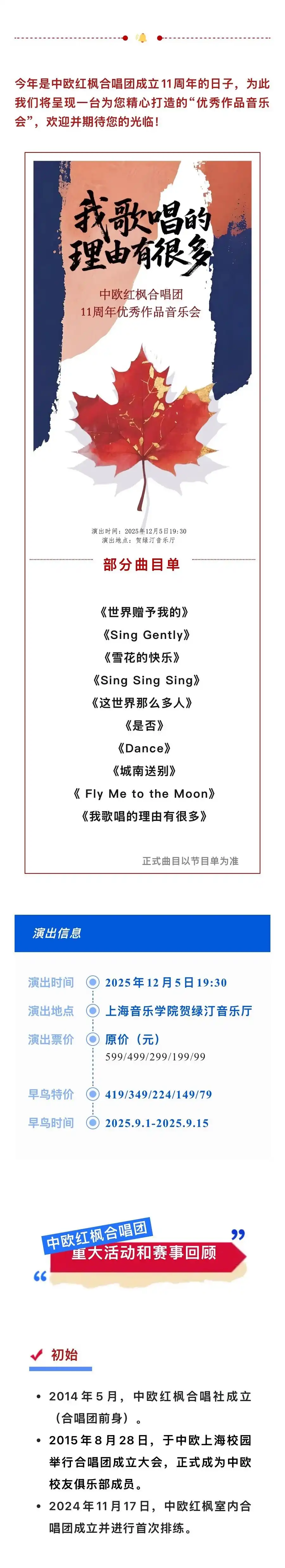 12月18日,让我们跟随中欧红枫合唱团走进上海东方艺术中心,用音乐向世界传递爱与和平的希望,祈愿每个人都可以毫无顾虑地去追求幸福与梦想。