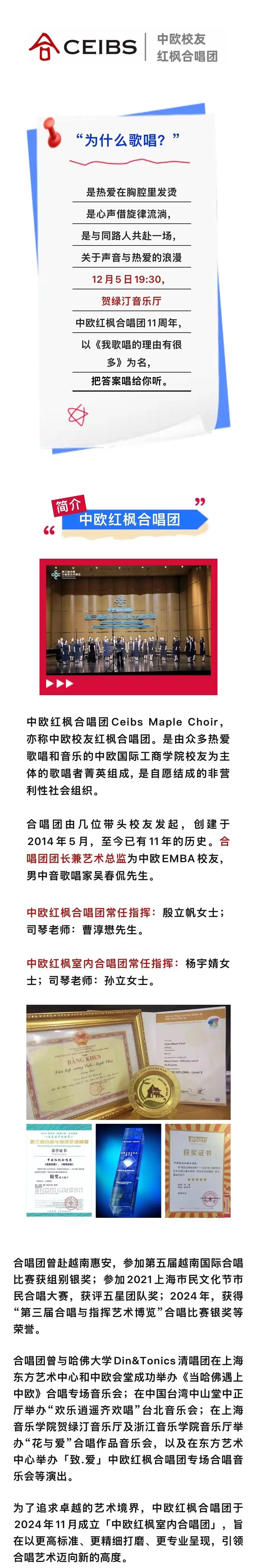 中欧红枫合唱团Ceibs Maple Choir(简称CMC),又称中欧校友红枫合唱团Ceibs Alumni Maple Choir,创建于2014年5月,至今已有9年的历史。中欧红枫合唱团是中欧国际工商学院校友俱乐部成员,中国合唱联盟成员,国际文化交流基金会成员。理事会会长和艺术总监为男中音歌唱家(中欧EMBA校友&合唱团发起人)吴春侃,轮值团长为合唱团理事秘书长王辉。