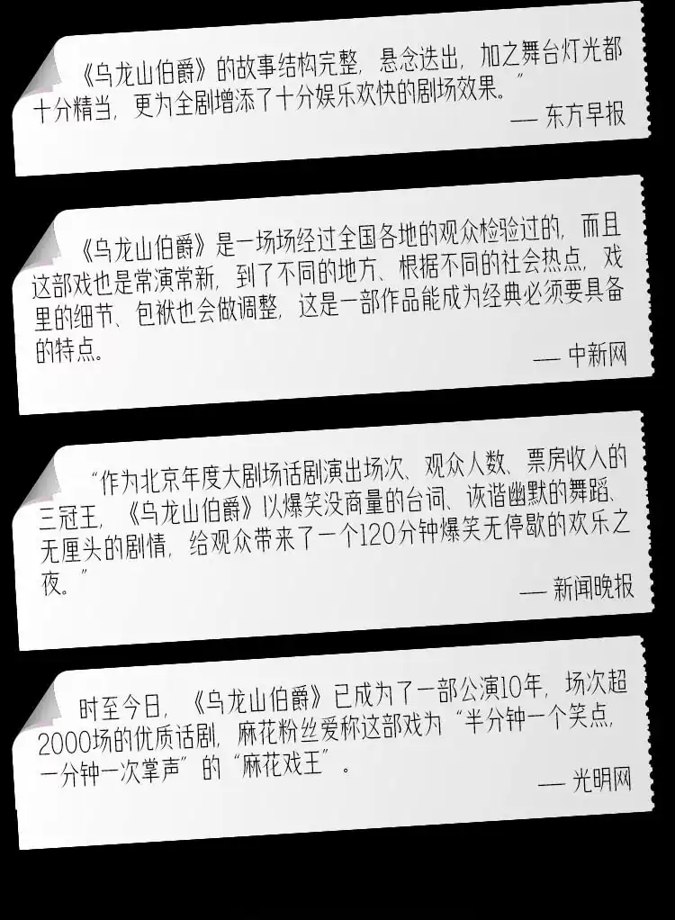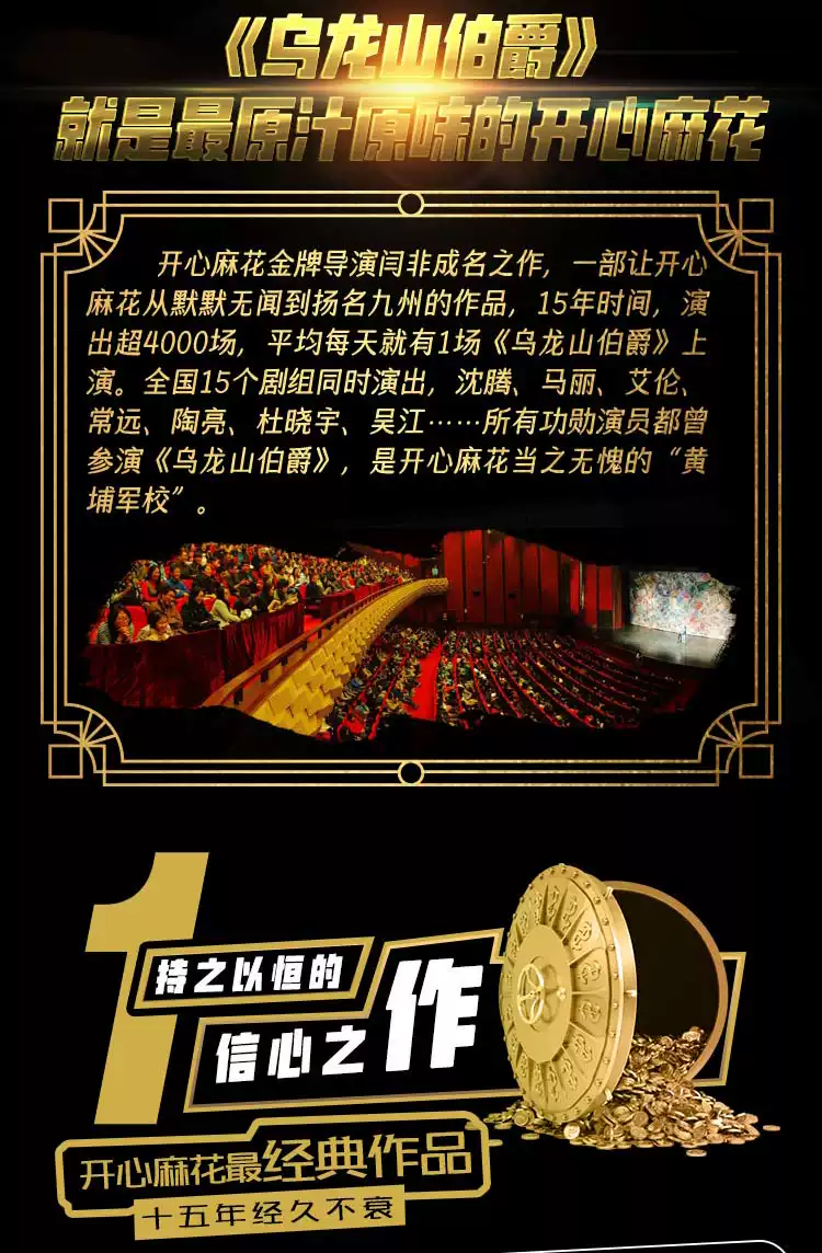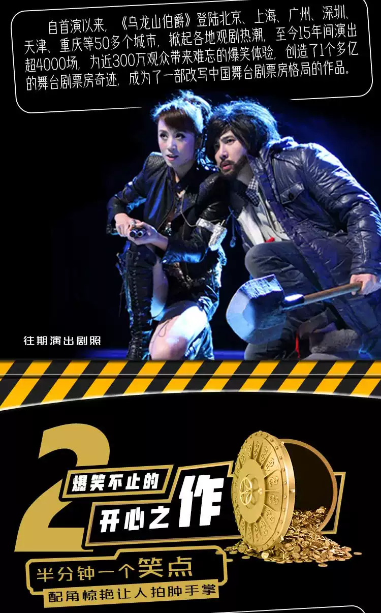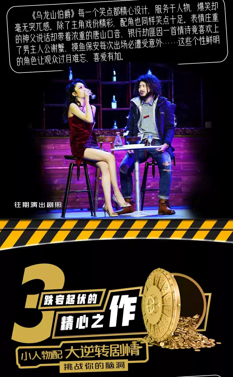 基本信息演出时间 2025-12-13 星期六 19:30 演出场馆 泰山大剧院 演出时长 以现场为准 儿童入场提示 儿童一律凭成人票入场 演出详情         开心麻花王牌爆笑大戏《乌龙山伯爵》泰安站 半分钟一个笑点,两分钟一次掌声,这可不是夸大其词! 经典之所以是经典,是因为我们的观后感一直再刷新,即使你走进剧场第二次、第三次,新鲜感依旧乘着5G的浪袭来,所以,看再多介绍,都不如走进剧场。 名梗不断,笑到不停,12月1日,相约泰山大剧院,收获一个爆笑无停歇的欢乐之夜。  演出简介: 《乌龙山伯爵》汇集了开心麻花最专业的演出团队,不仅主角戏份精彩,配角也时常制造出经典片段。 它由导演闫非编剧、导演,同时,闫非导演也是开心麻花“郝建”系列等春晚作品的编剧、导演,是国内舞台剧最具票房号召力的导演之一,闫非精心打磨三年,以近乎完美的戏剧结构呈现《乌龙山伯爵》,成就开心麻花长盛不衰的“剧王”。  作为开心麻花最经典的一部作品,看《乌龙山伯爵》已经成了万千开心麻花戏迷心中的情结。 自2010年11月首演,《乌龙山伯爵》的演出场次已超过3000场,在全国50多个城市巡演,为百万观众带来难忘的爆笑体验,创造了观众单刷82场的记录,也创造了1亿多舞台剧票房奇迹。  剧情简介: 一个无工作、无房子、无车子的“三无”青年谢蟹忽然得到巨额遗产,又阴差阳错地被误认为是银行劫匪而被警方通缉,和一群互不相识的亡命之徒来到教堂。于是众人开始在惊心动魄的“杀人游戏”中寻找混入的“平民”。 而谢蟹在竭力自保的同时,却发现隐瞒真实身份的绝非自己一个……知情者要么死去,要么是他的对手!他该如何实现自我救赎?  这是一场爆笑又难忘的视觉盛宴,场景堪比电影大片! 阴森教堂、逼真墓地、惟妙惟肖的十字架……舞美场景,美轮美奂。 而让观众熟练背诵的“鼻尖跳水”情诗、演一遍笑一遍的珍珠奶茶梗、卖坟的片段更是经典永流传,热血复仇的故事外壳之下的温情内核也是观众们为之打call的原因,不知道你会在其中收获到哪些呢?敬请期待!  12月1日,相约泰山大剧院,一起去“乌龙山”上闯一遭,我们不见不散! 展开更多收起