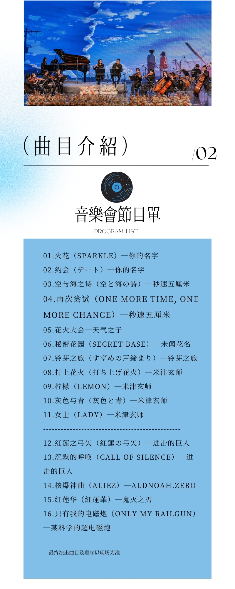 本场音乐会将原神、新海诚、米津玄师的系列作品进行了精彩演绎,集结了顶级的团队,从制作团队、乐队、幕后等各工种部门都拿出了自己最专业的工作态度,共同努力将最好的一幕显现给观众。