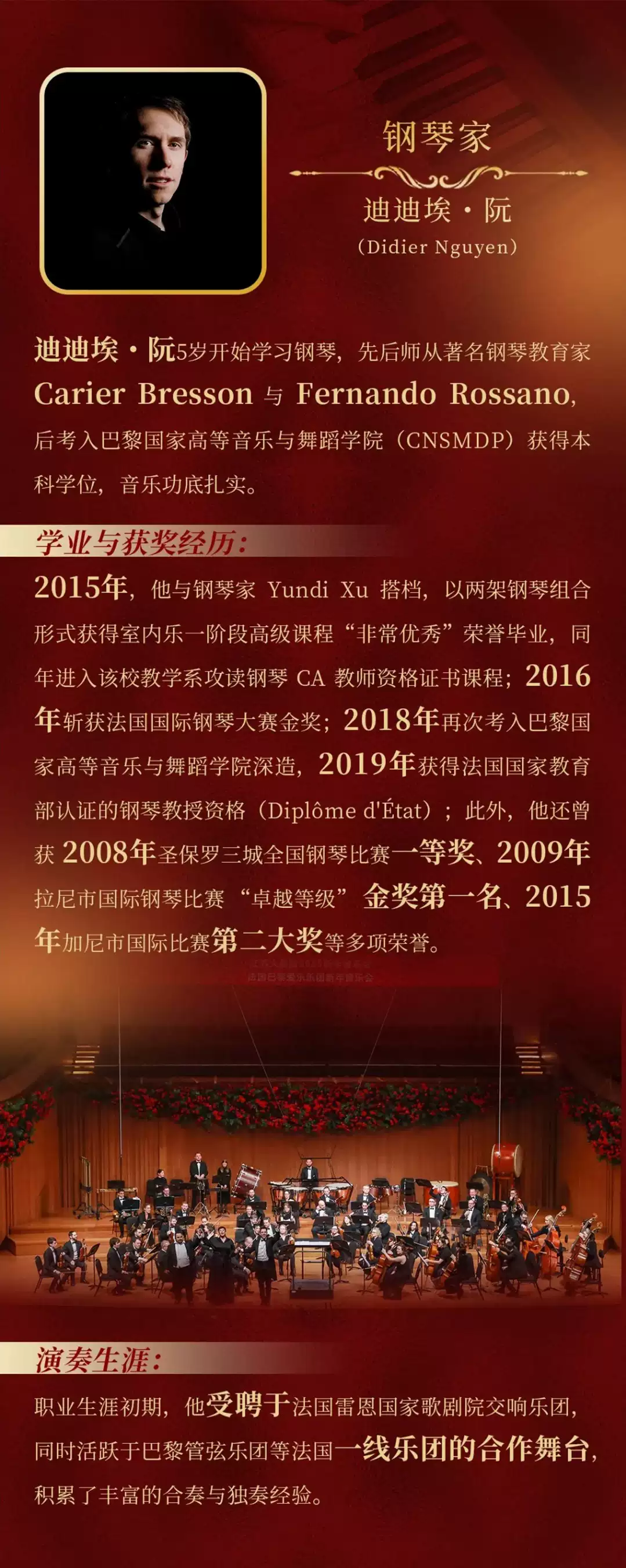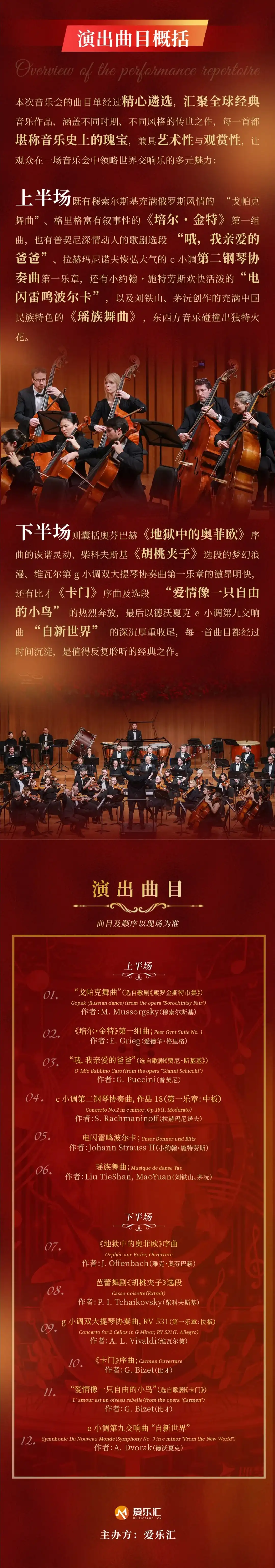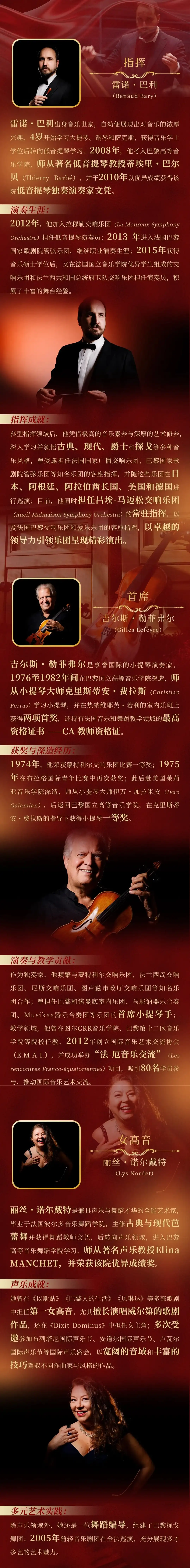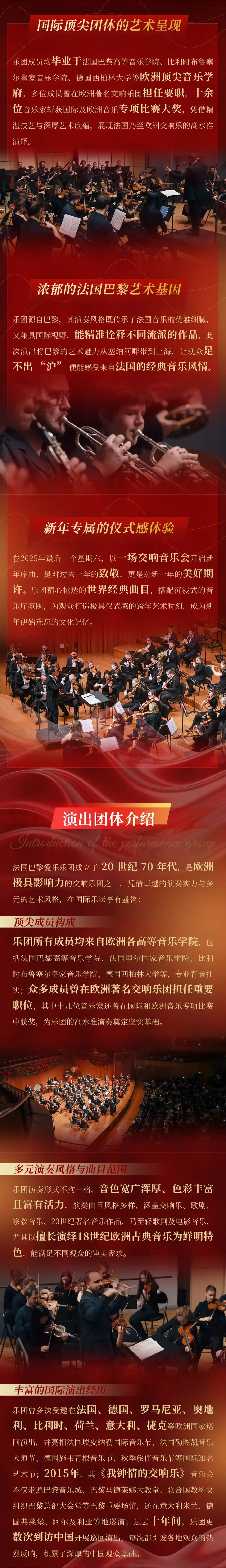 来自法国巴黎爱乐乐团的艺术家们即将在现场献上一场充满欧洲百年传统仪式感的音乐会,曲目单覆盖了新年音乐会的传统曲目、中国节庆曲目,同时也涵盖了著名歌剧的精彩片段......如大众熟悉的《春节序曲》,充满着生机与自由的《吉普赛之歌》 ,新年音乐会必不可少的《蓝色多瑙河》带来活力与愉悦。