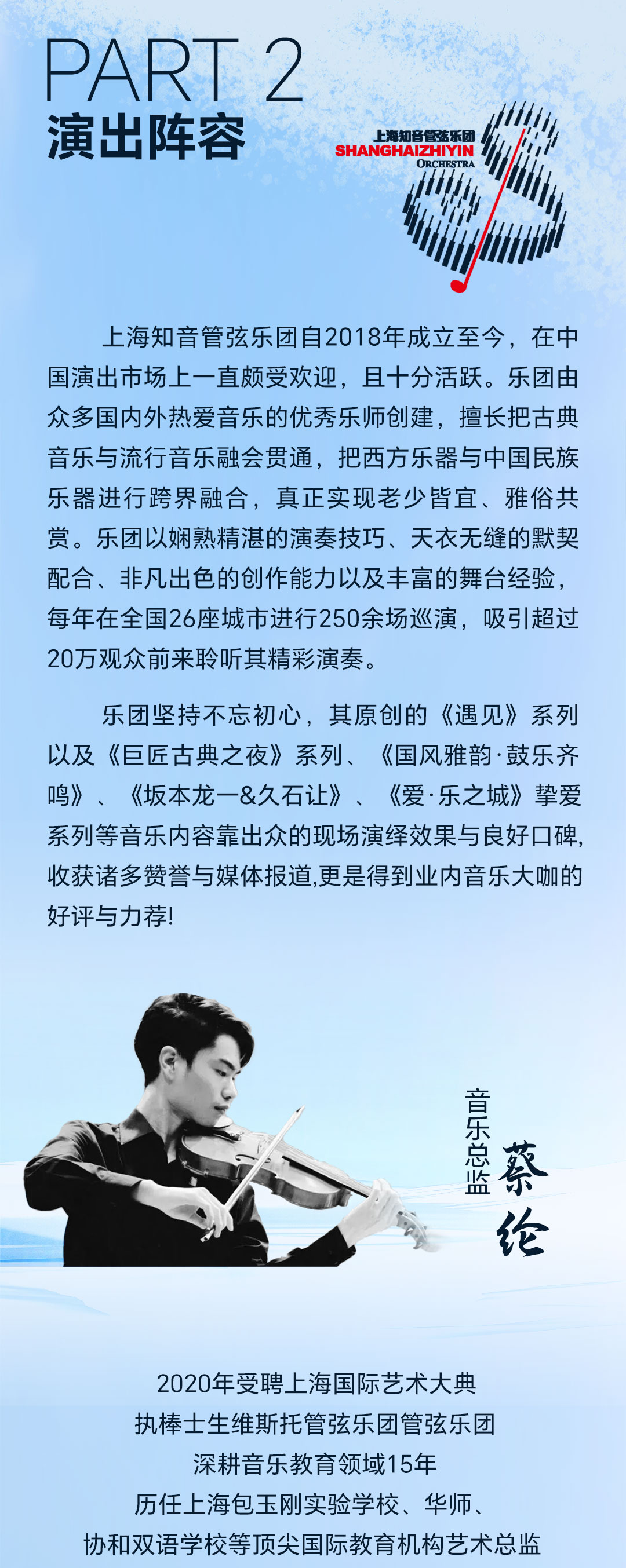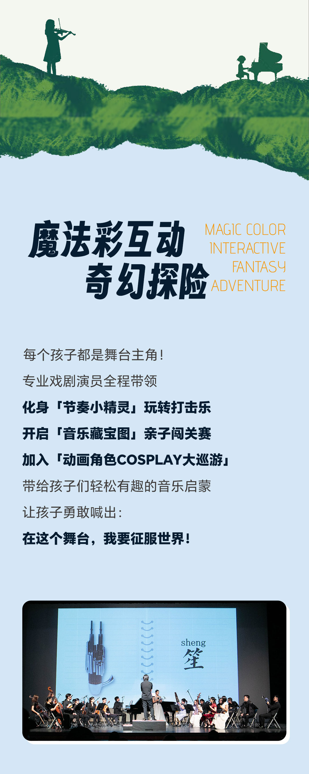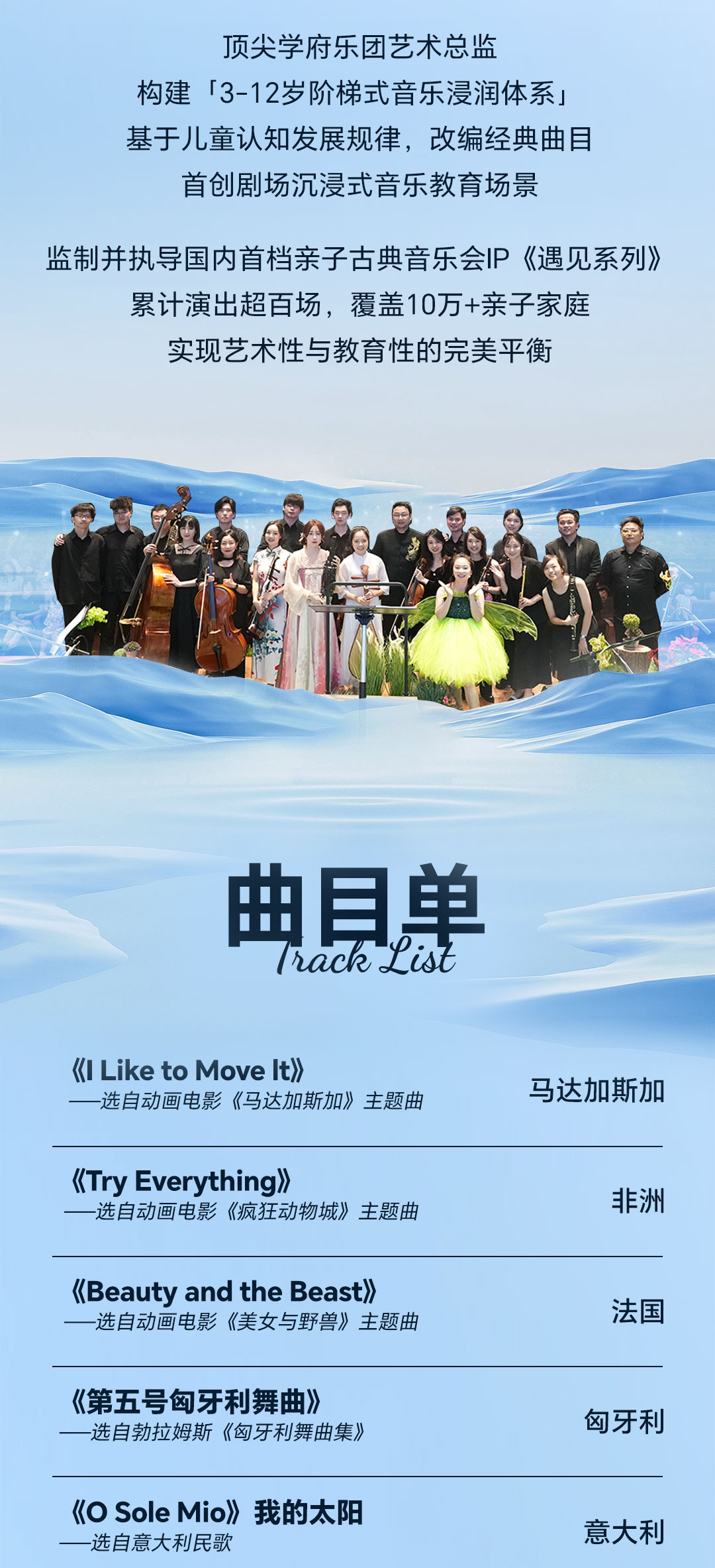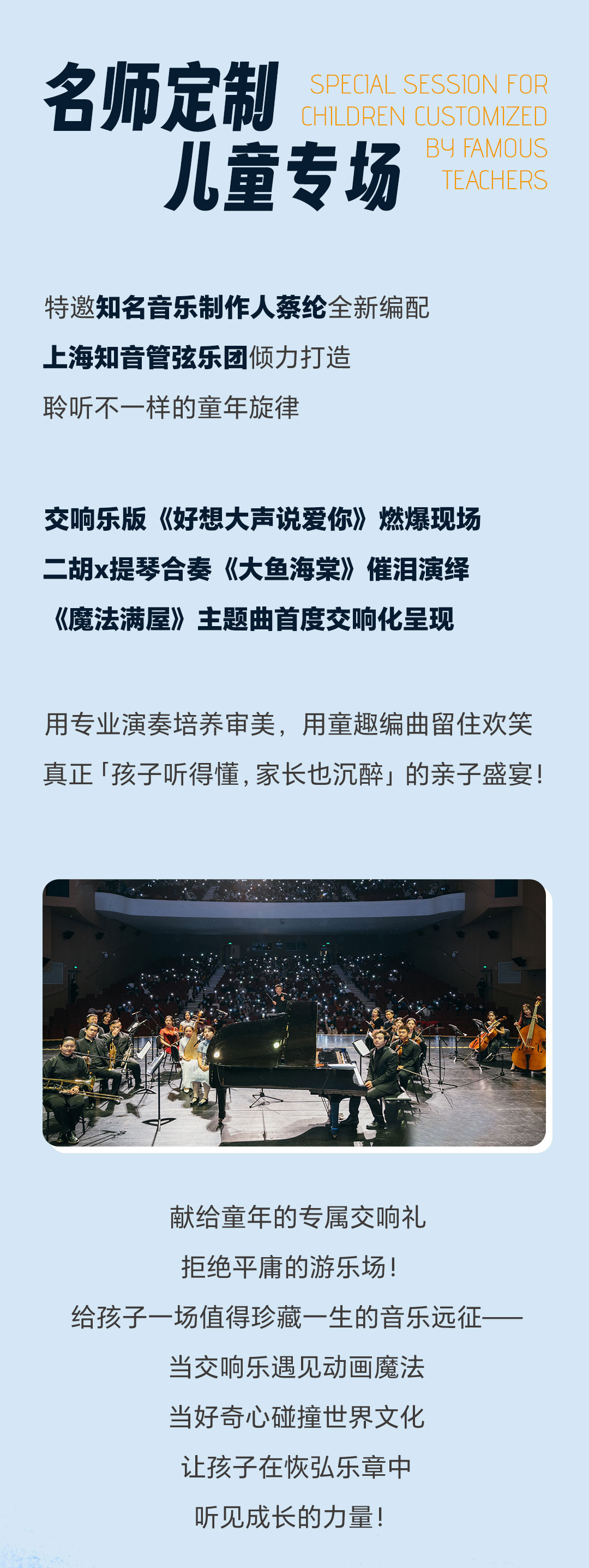 名师打造最懂孩子的音乐会:由知名音乐制作人蔡纶先生带领上海知音管弦交响乐团实力演绎,他凭借十余年教学经验针对儿童习得特性科学改编,从亲子音乐会演出特性出发合理调整了曲风结构,让在场小朋友可以轻松学认真听,还能满足成人的审美需要,趣味性、专业性、欣赏性、多维合一的专业亲子音乐会!