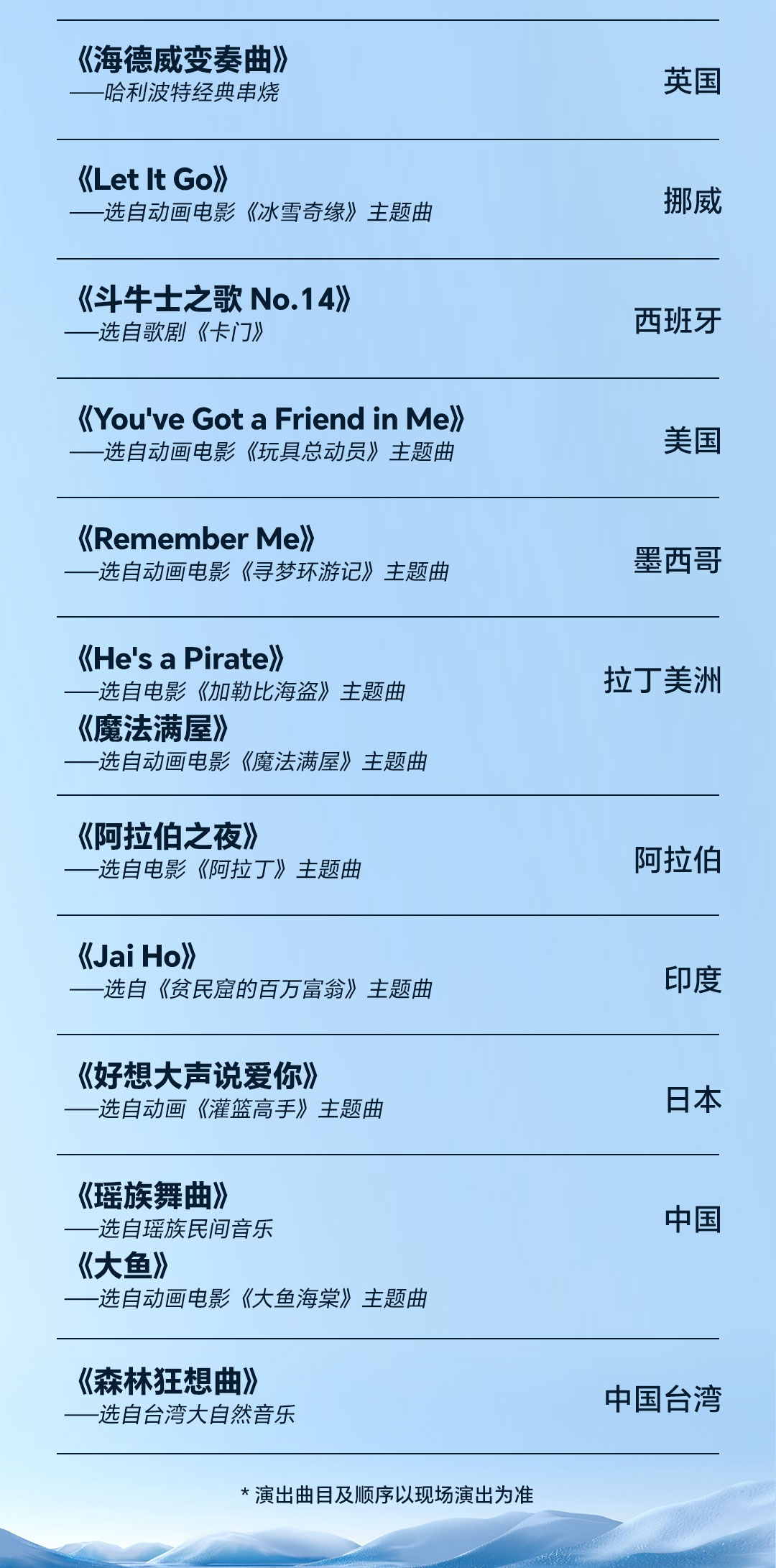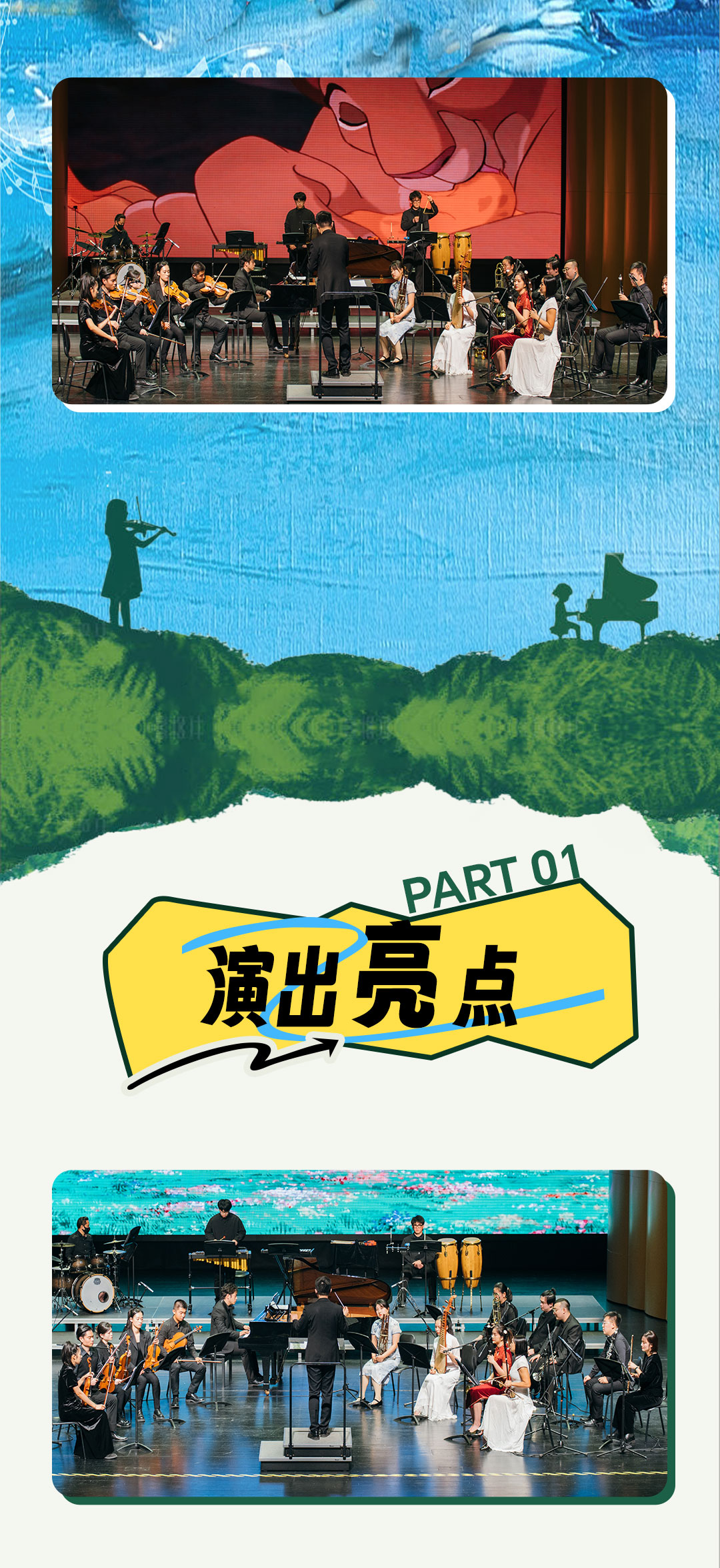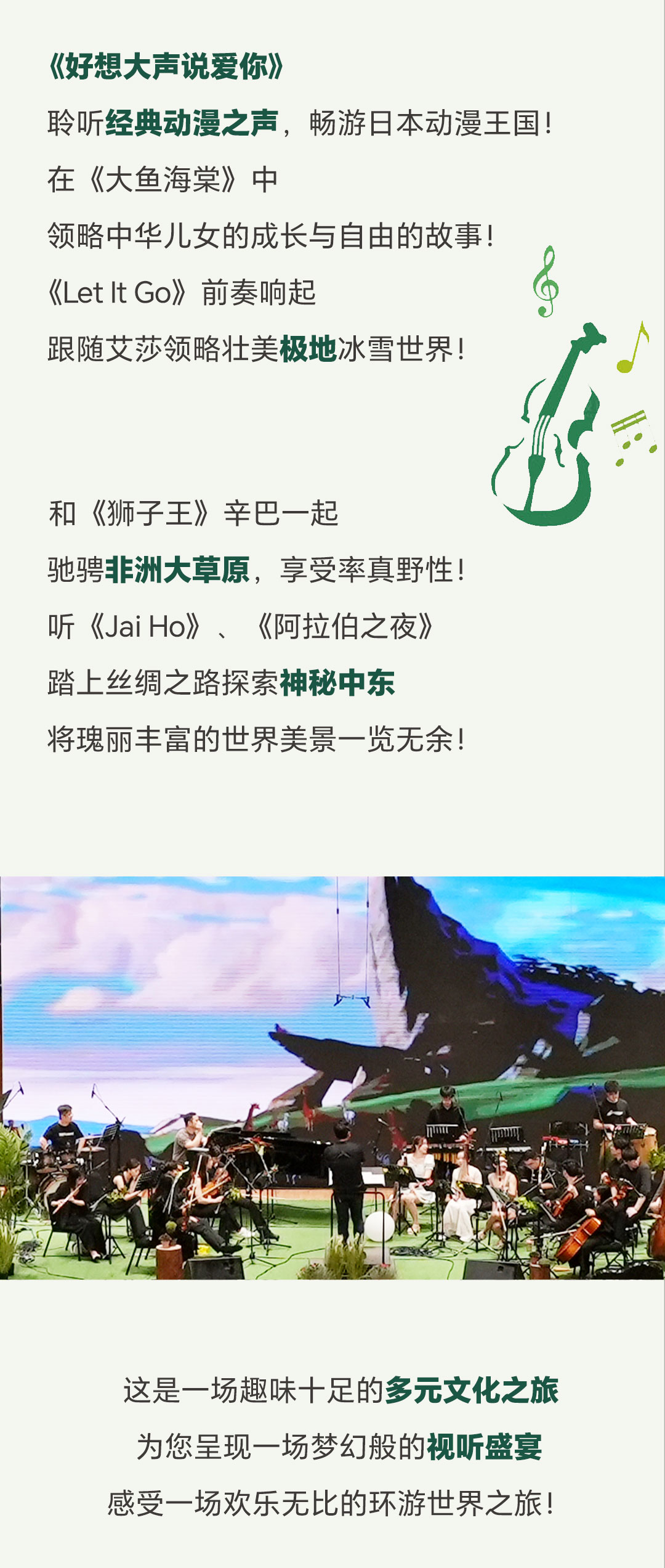 聆听经典动漫《灌篮高手》之声,畅游日本动漫王国,打击乐、弦乐、民乐轮番演绎世界经典动画电影配乐,带你从亚洲漫游非洲、北极、美洲;听《木兰》的歌曲,随花木兰出征,领略中华儿女的坚毅热血;《let it go》前奏一响起,就可以跟随艾莎,领略壮美极地冰雪世界;遇见《狮子王》辛巴,驰骋非洲大草原享受率真野性;听《Jai ho》《阿拉伯之夜》,踏上丝绸之路探索神秘中东,将瑰丽丰富的世界美景一览无余!