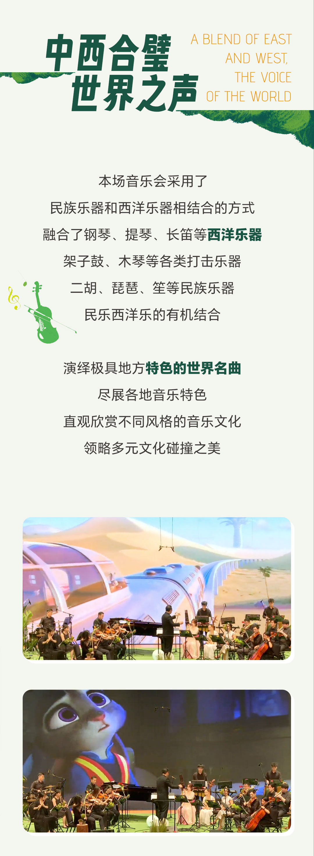 中西合璧,世界之声:本场音乐会使用了民族乐器和西洋乐器相结合的方式,融合钢琴、提琴、长笛等西洋乐器,架子鼓、木琴等各类打击乐器,二胡、琵琶、笙等民族乐器,民乐西洋乐的有机结合演绎极具地方特色的世界名曲,尽情展示各地音乐特色,直观欣赏不同风格的音乐文化,领略多元文化碰撞之美!