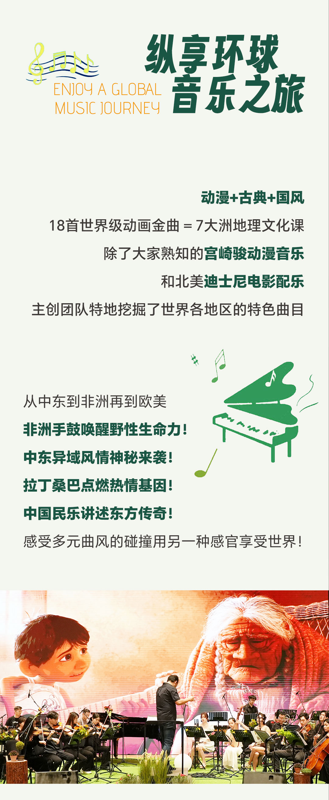 这绝对可以堪称是一场趣味十足的多元文化之旅,为每个观众呈现一场梦幻般的视听盛宴,感受一场欢乐无比的环游世界之旅就从此刻开始!从中国出发乘坐我们的专属航班亲临由诸多经典动漫音乐以及电影音乐融汇而成的音乐海洋,和孩子在剧场中收获充满惊喜和挑战的环球音乐之旅!