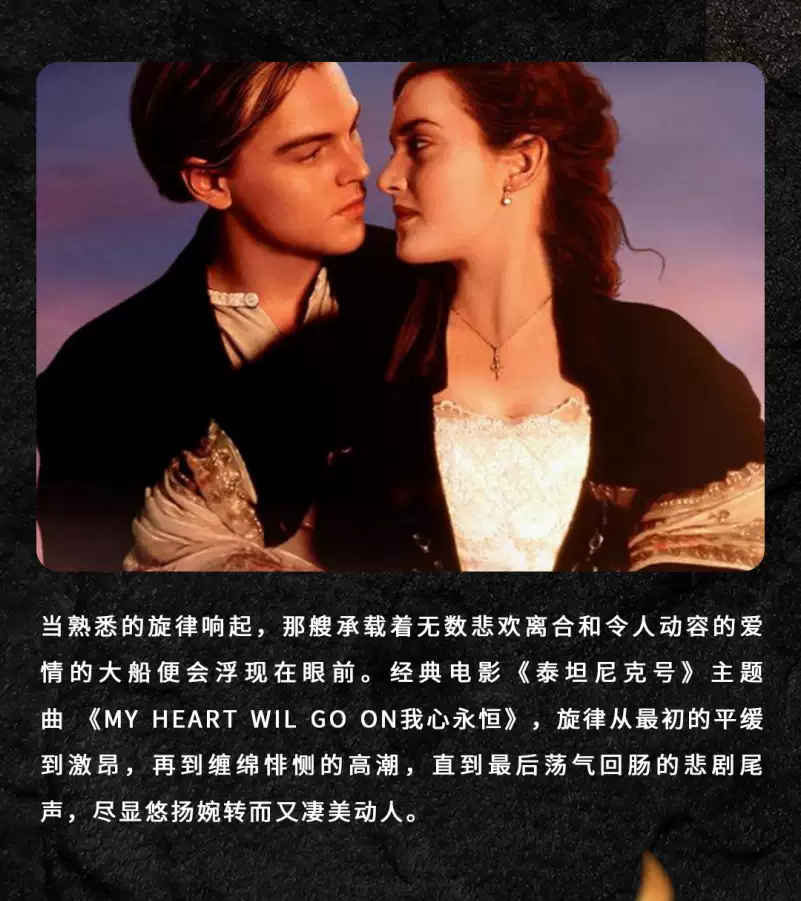 耳熟能详的经典电影音乐,即使是不同风格类型的电影中的背景音乐,但当旋律响起的那一刻定能使你产生强烈的情感共鸣。