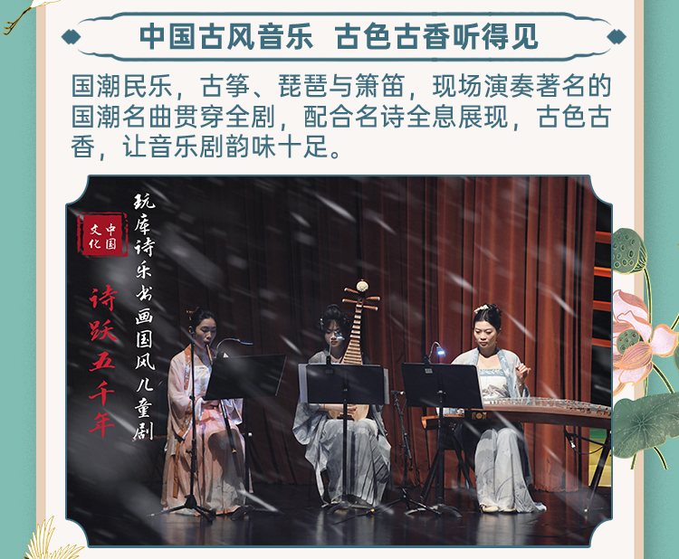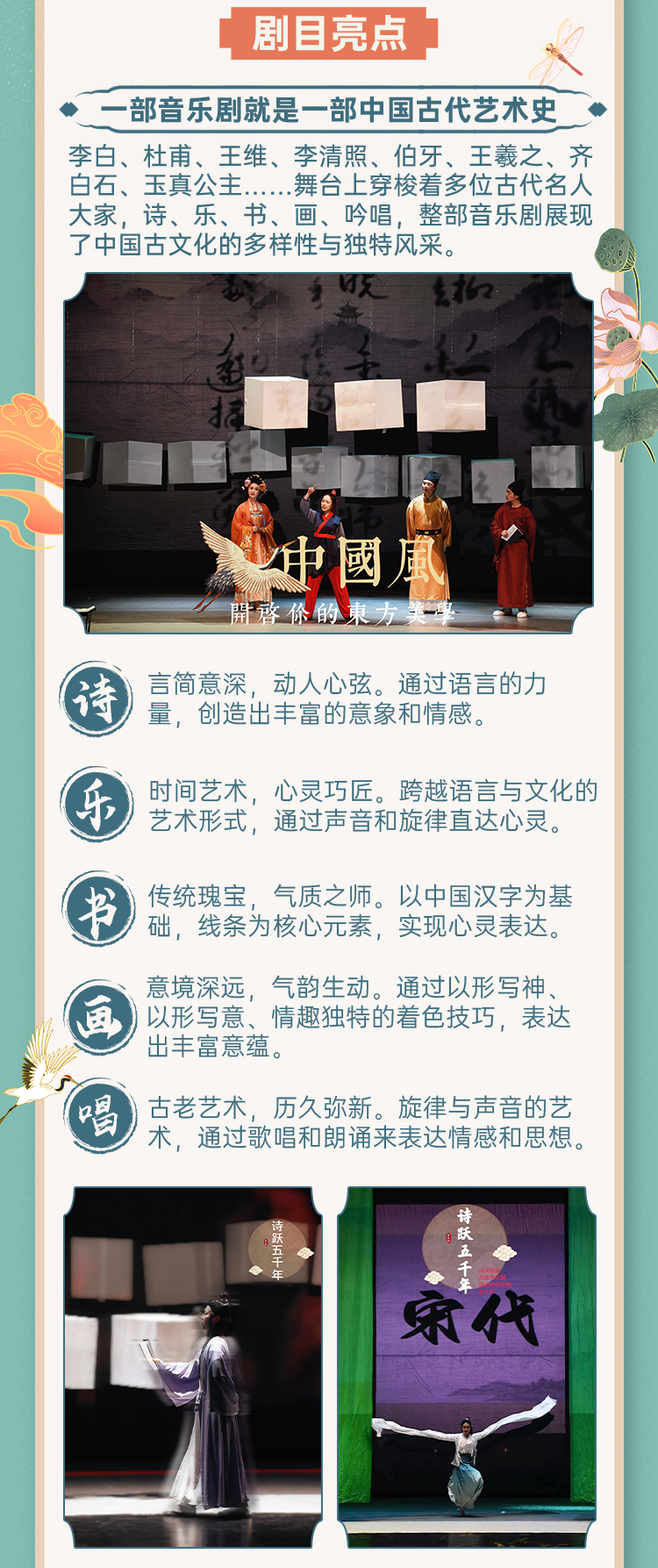 穿古越今,以古诗为线索,乘载着美妙的古乐,感悟中华古文化中诗、乐、书、画、吟唱的独特风韵。