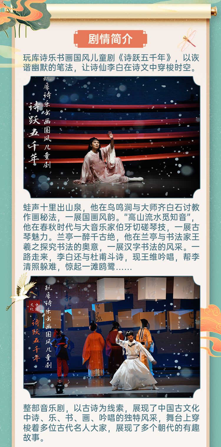 诗乐书画国风儿童剧《诗跃五千年》以美轮美奂的视觉,诙谐风趣的笔法,带领大家进入诗仙李白的诗文天地。