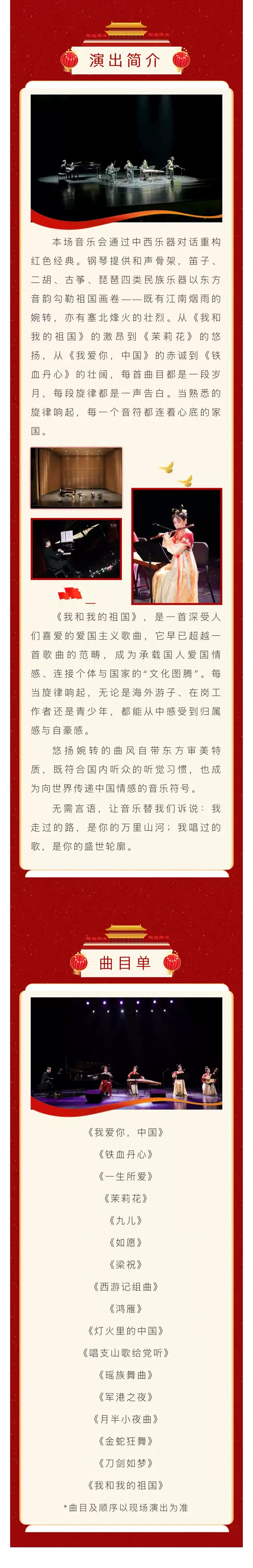 而本场音乐会除《我和我的祖国》之外,还会有《卡农》《彩云追月》《花儿为什么这样红》《瑶族舞曲》《我爱你中国》等诸多的经典曲目。