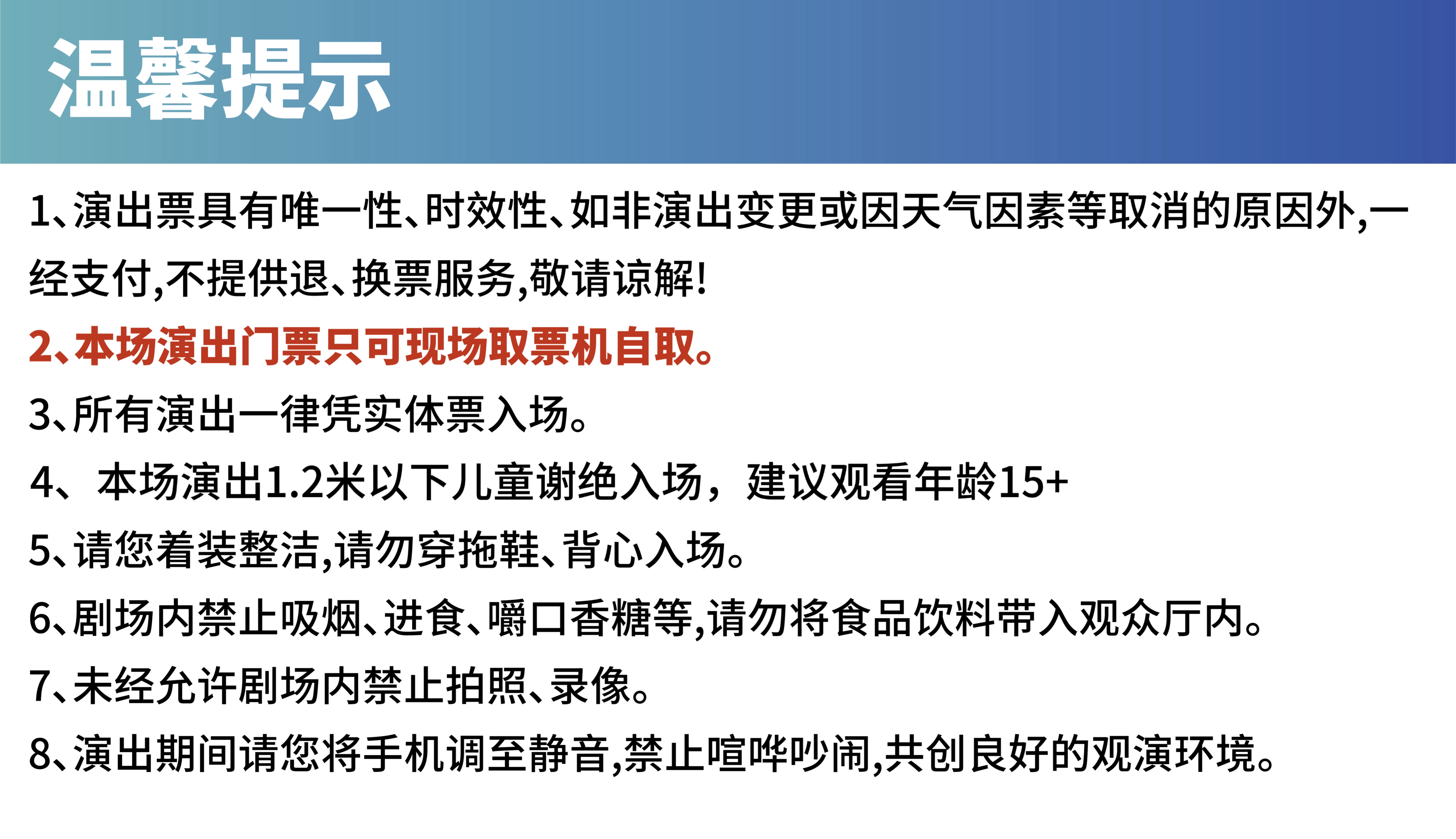 4.入场后,请严格按照票面指定区域和座位对号入座,请勿在演出期间换座,文明观演。