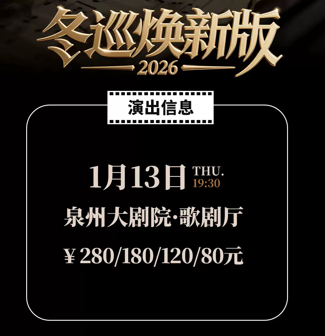 演出时间 2026-01-13 周二 19:30 演出场馆 泉州大剧院歌剧厅 演出时长 以现场为准 儿童入场提示 1.2米以上凭成人票入场,1.2米以下谢绝入场。 演出详情