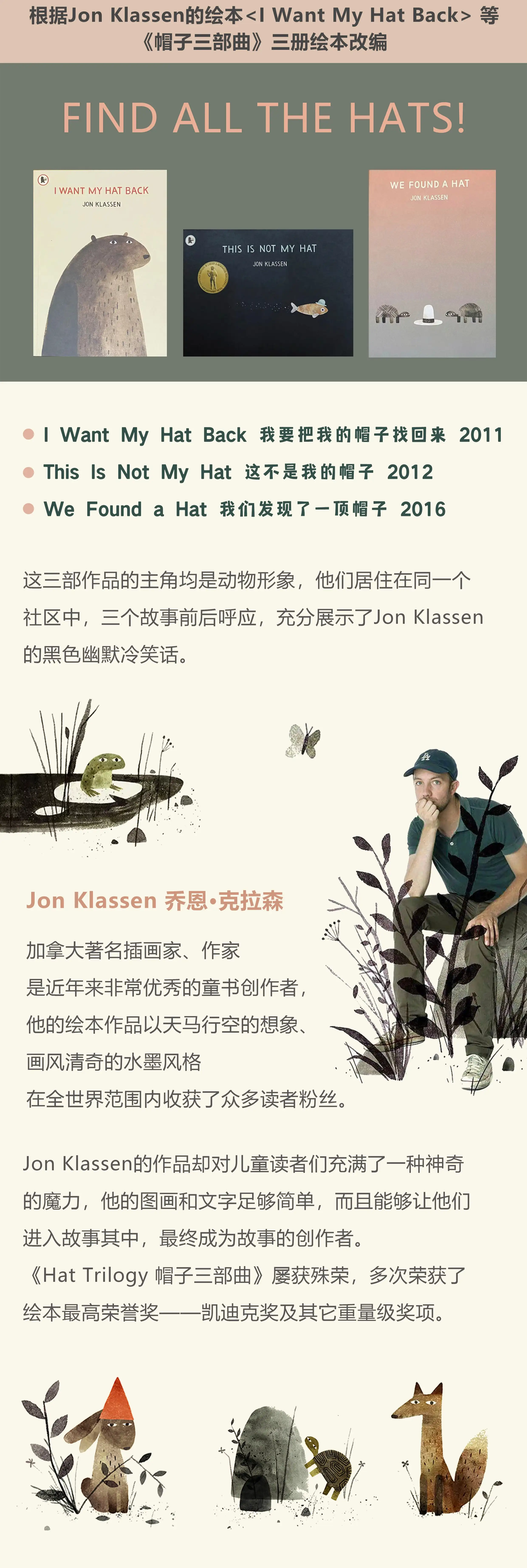 木偶互动剧《我要把我的帽子找回来》根据凯迪克金奖、凯特·格林纳威大奖双料得主乔恩·克拉森的“帽子三部曲”绘本改编。其中《我要把我的帽子找回来》一经出版便斩获苏斯博士银奖,并且入围了英国凯特·格林纳威奖(英国儿童图画书的最高荣誉)。