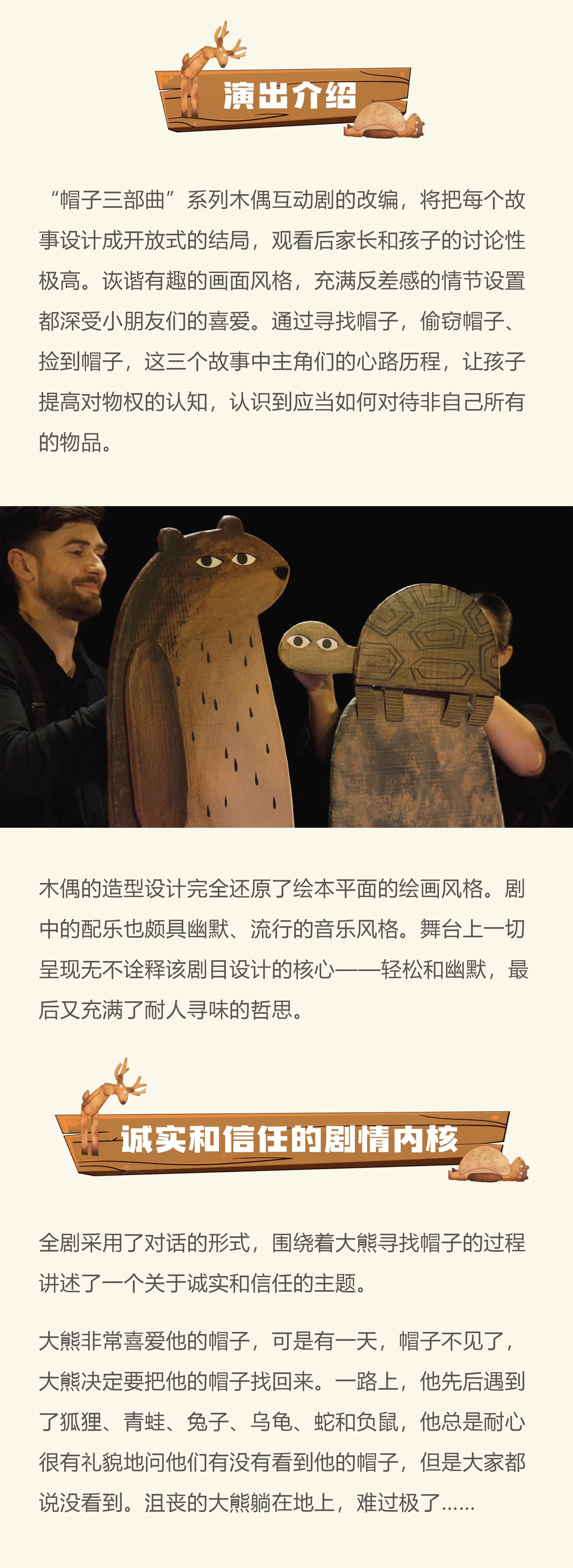 “帽子三部曲”系列木偶互动剧的改编,将把每个故事设计成开放式的结局,观看后家长和孩子的讨论性极高,极大地拓展了孩子们的想象空间。全剧让孩子们在享受木偶剧乐趣的同时,又能提升独立思考与辨别是非的能力,是一部适合全家人一同观看的优秀木偶剧作品。