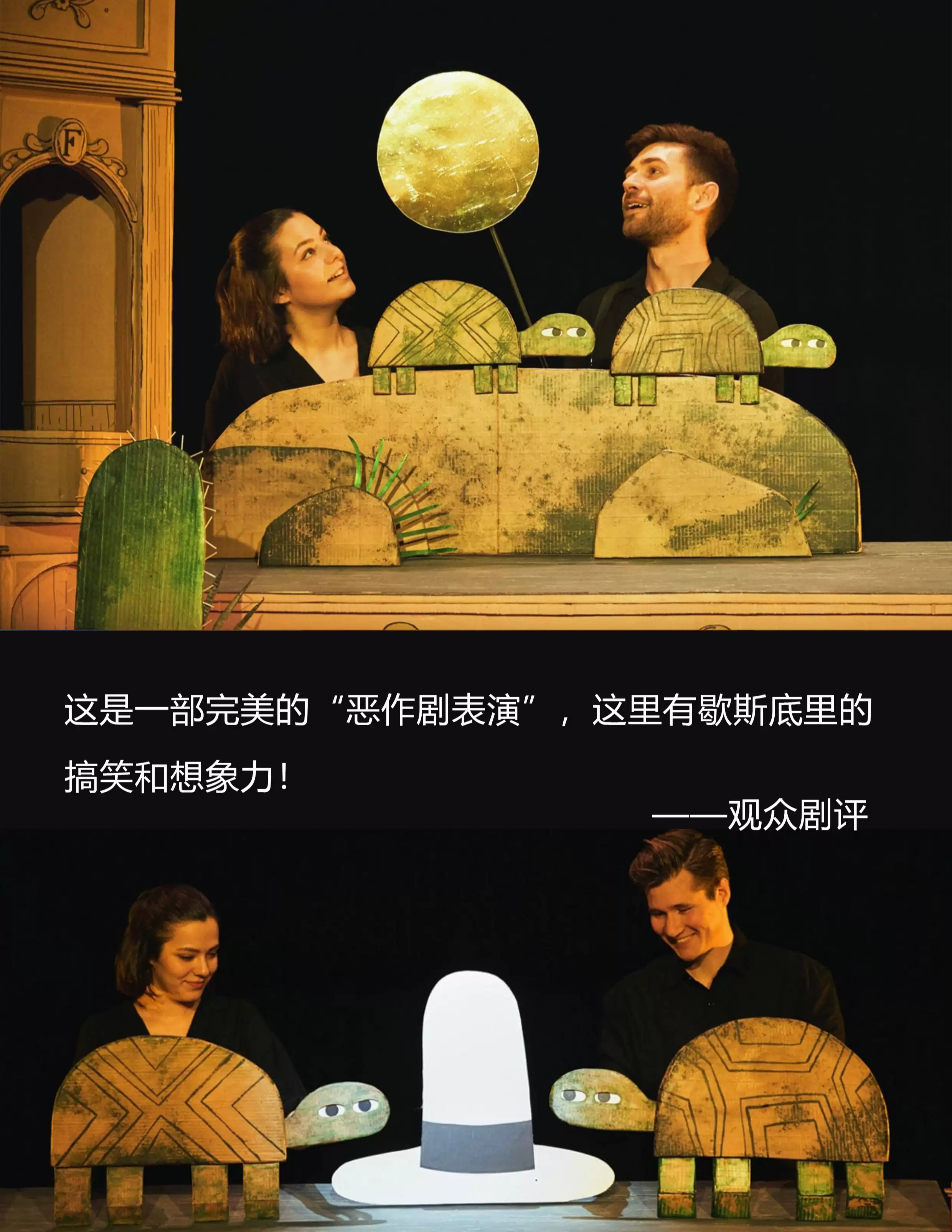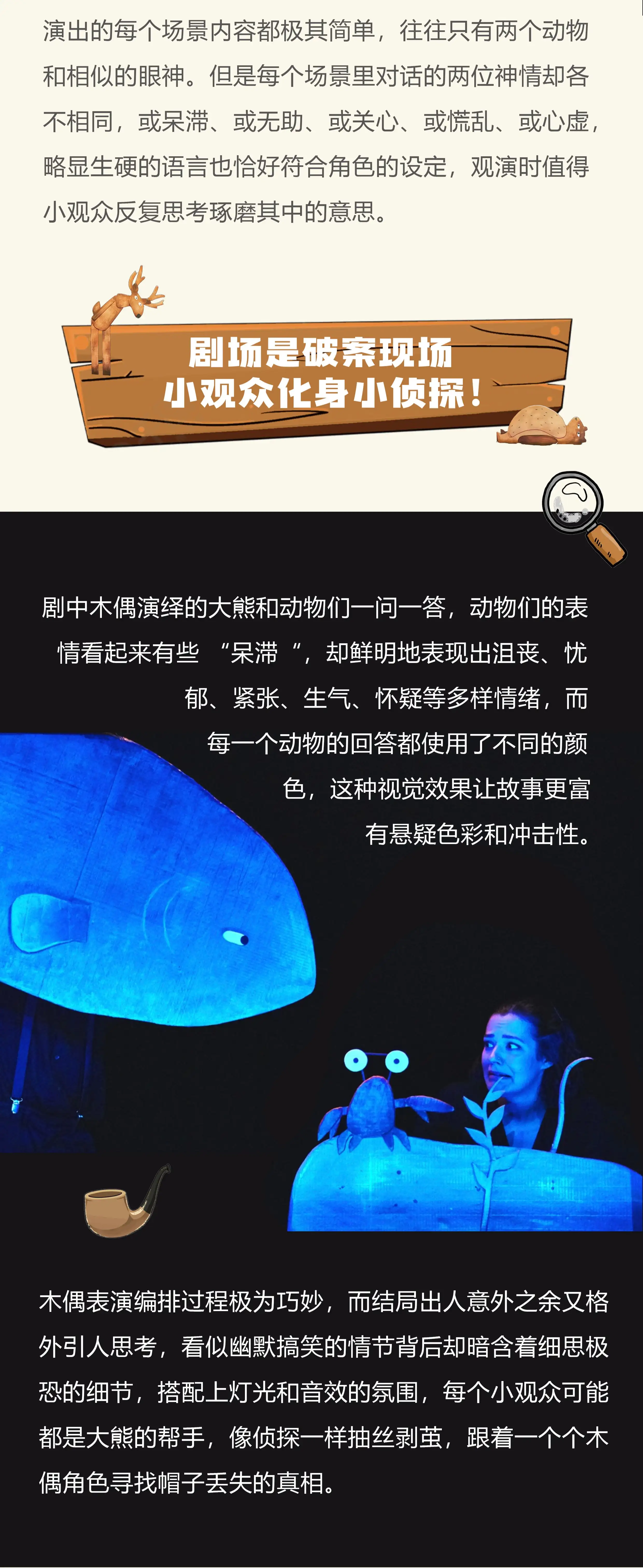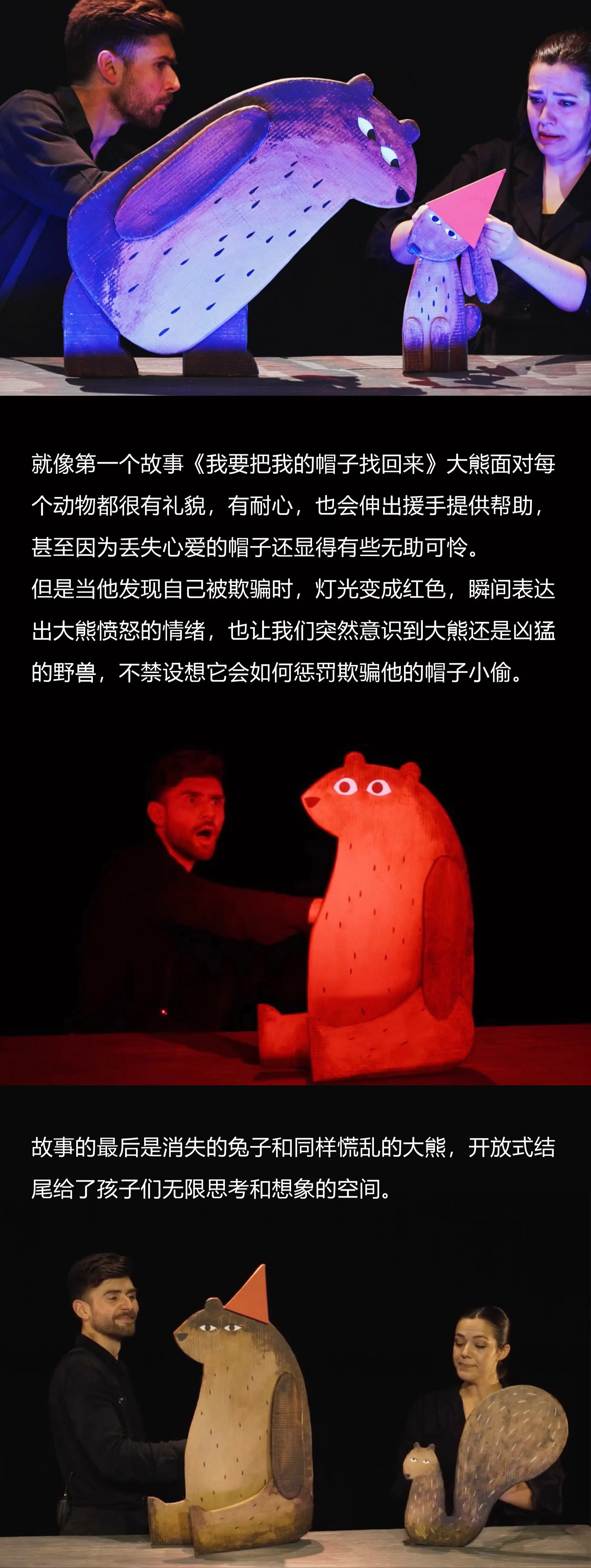木偶的造型设计完全还原了绘本平面的绘画风格,并在表演编排过程极为巧妙,而结局出人意外之余又格外引人思考。看似幽默搞笑的情节背后却暗含着细思极恐的细节,搭配上灯光和音效的氛围,每个小观众可能都是大熊的帮手,像侦探一样抽丝剥茧,跟着一个个木偶角色寻找帽子丢失的真相。