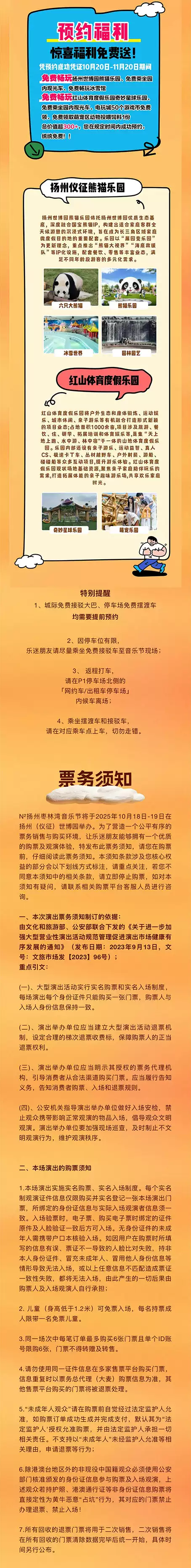 演出时间 2025.10.18-10.19 演出场馆 扬州世博园 演出时长 以现场为准 儿童入场提示 1.2米以下儿童免票,需家长陪同(每个成人仅能带一名儿童)