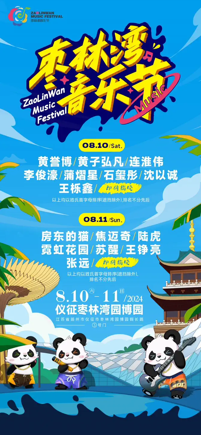 2024扬州枣林湾音乐节正式启动,8月10日至11日,走进扬州仪征枣林湾园博园,两天接连不断的重磅阵容,用音乐唤醒你沉寂已久的音乐细胞!