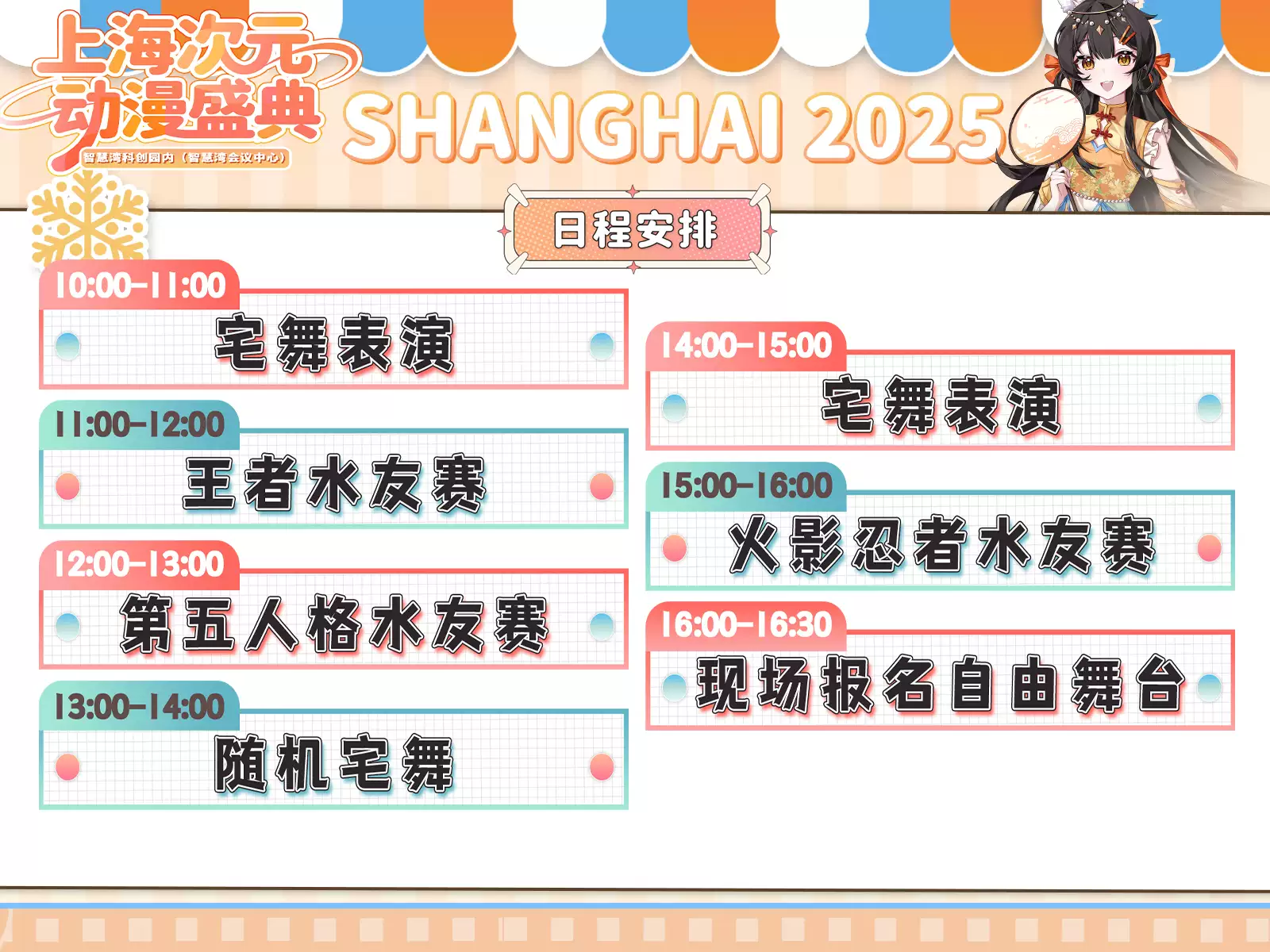 为二次元爱好者打造一个实体化世界,夏日燃歌、动感宅舞、珠三角cosplay团体赛,燃歌宅舞大比拼、LOL盛装互动、超还原动漫场景,游戏全面升级,著名的COSER百花齐放,各式各样的嘉宾同场PK,带你体验风起云涌的刺激感,让热爱二次元的你我沉浸在这个自由欢乐的新天地。