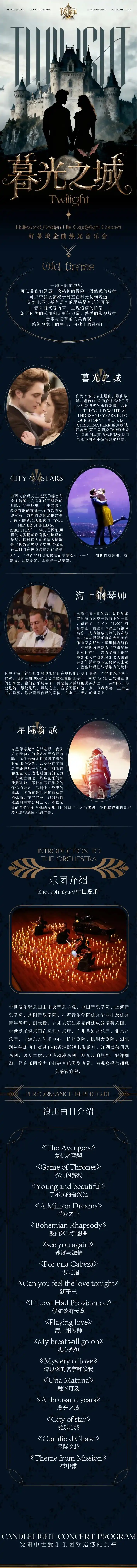 《暮光之城》电影金曲主题音乐会的选曲覆盖了好莱坞各大电影经典配乐,观众将在悠扬的旋律和氤氲的烛光中,重温那些经典的影视故事。