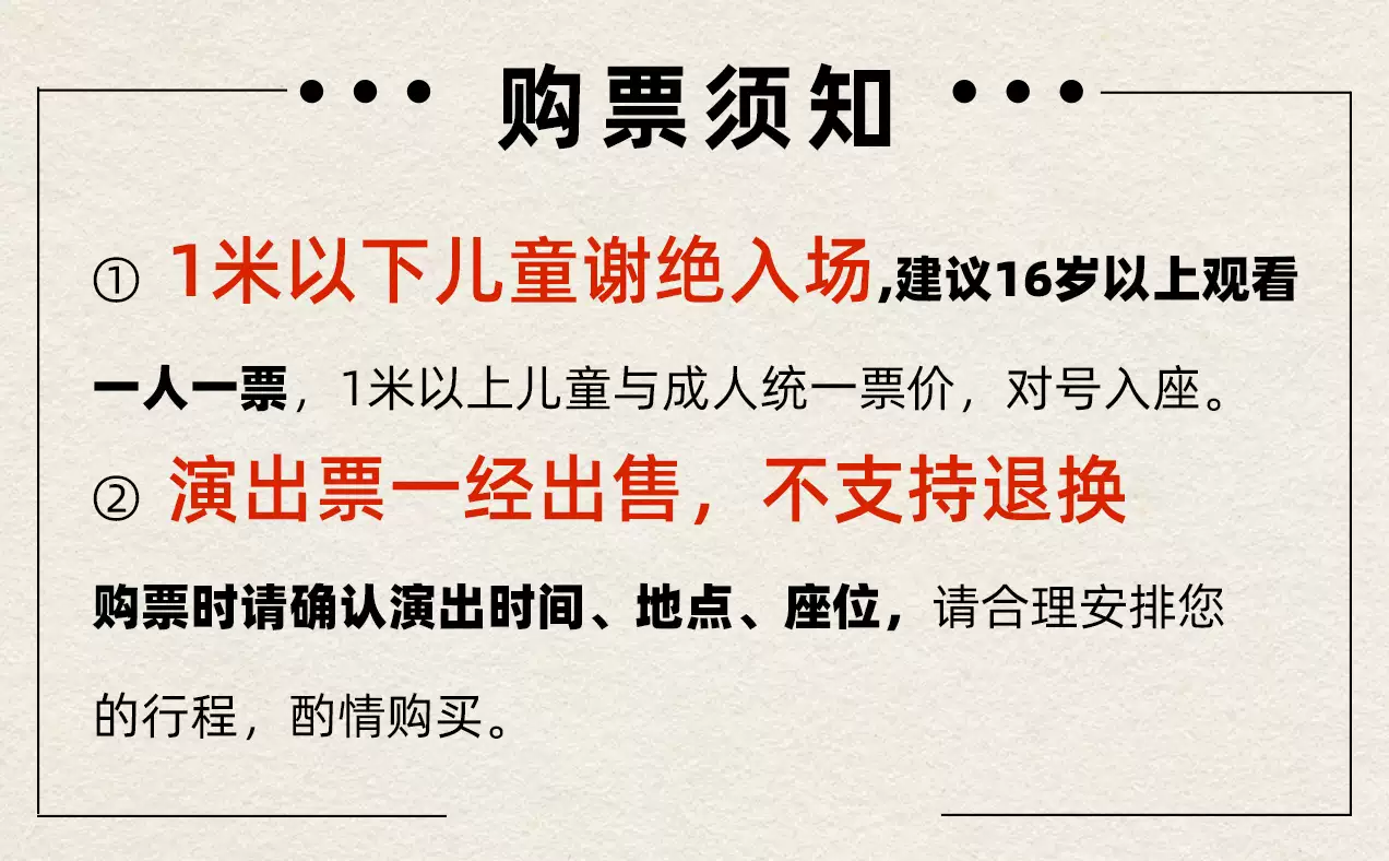 1.购买前请您提前规划好行程,做好相应准备,以免影响您的正常观演,感谢您的理解和配合。