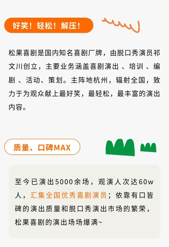 松果喜剧是国内知名喜剧厂牌,由脱口秀演员祁文川创立,主要业务涵盖喜剧演出、培训、编剧、活动策划四个模块,可以为有喜剧内容需求的公司、团体和个人提供优质的内容输出,定制门店活动与喜剧专场。至今已演出5000余场,观演人次达60w人。目前有合作开放麦演员700余人,商演演员300余人。依靠有口皆碑的演出质量和脱口秀演出市场的繁荣,松果喜剧的演出场场爆满,一票难求。