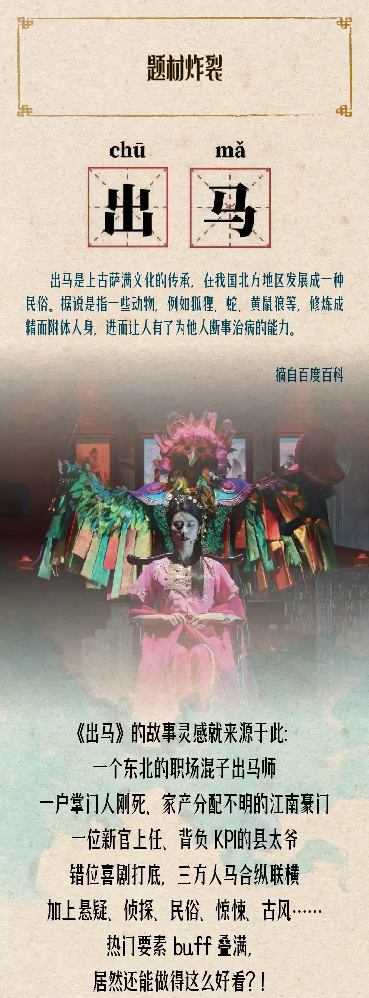 何为“出马”?古时候人们信奉神鬼,所以有了巫师这个行业,延续到今日,便成为了出马,据说,这是萨满文化与明清时期华北地区 “四大门”文化融合的产物,而所谓的“出马师”,其实就是是东北的巫师—人类和神灵的沟通使者、鬼神的代言人。