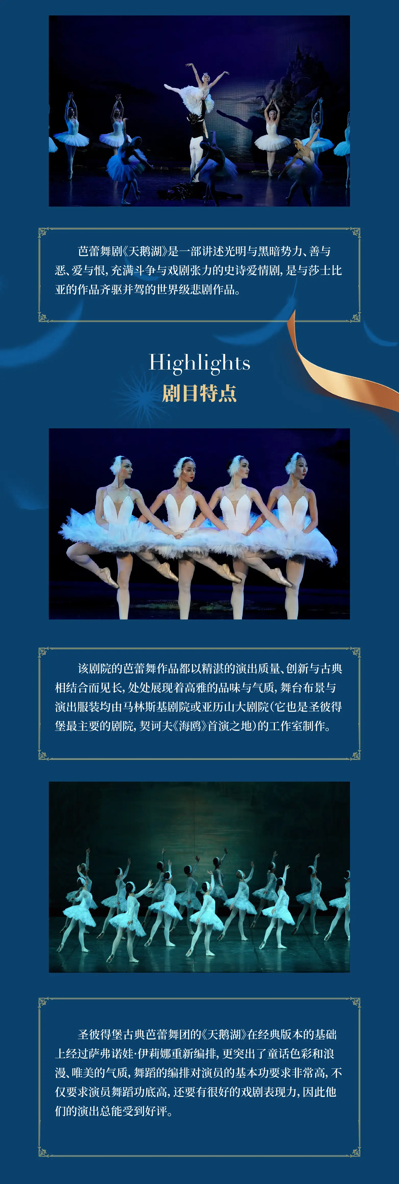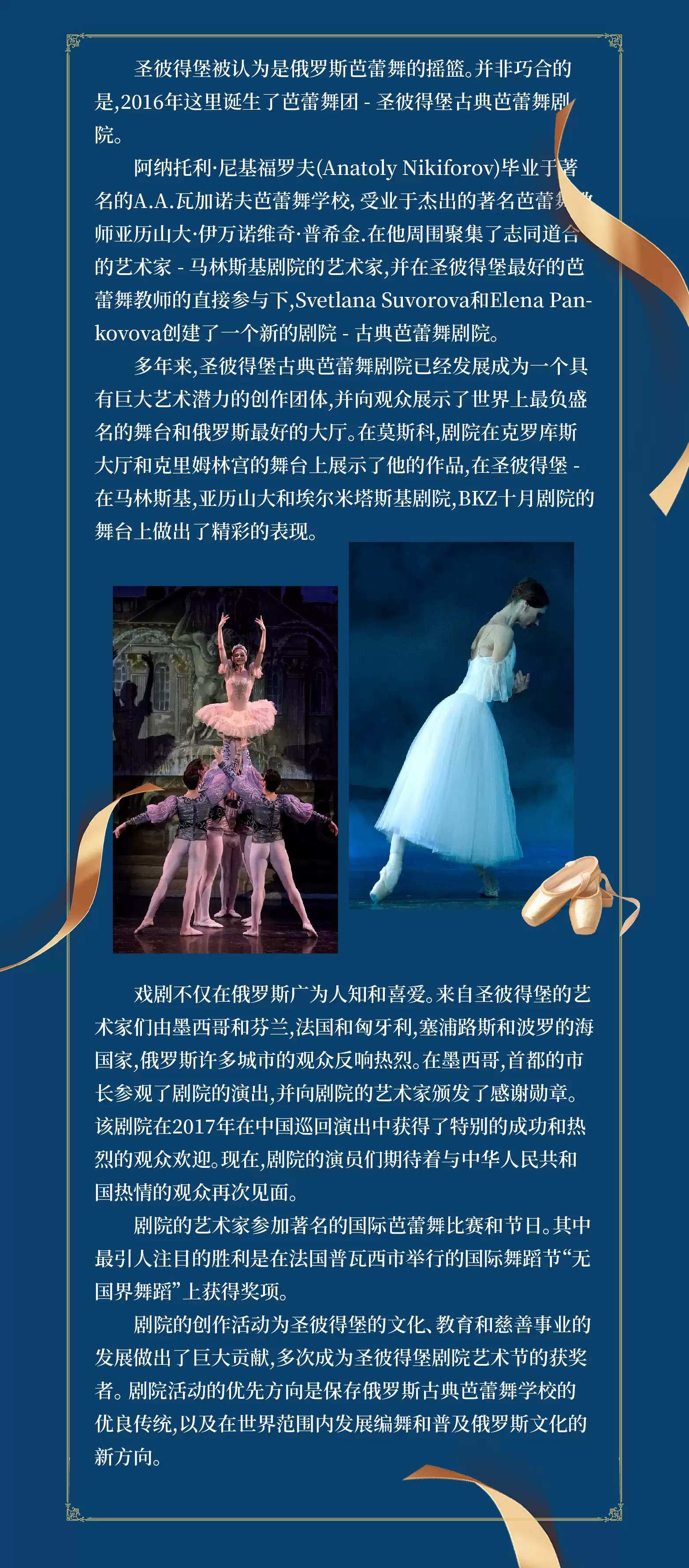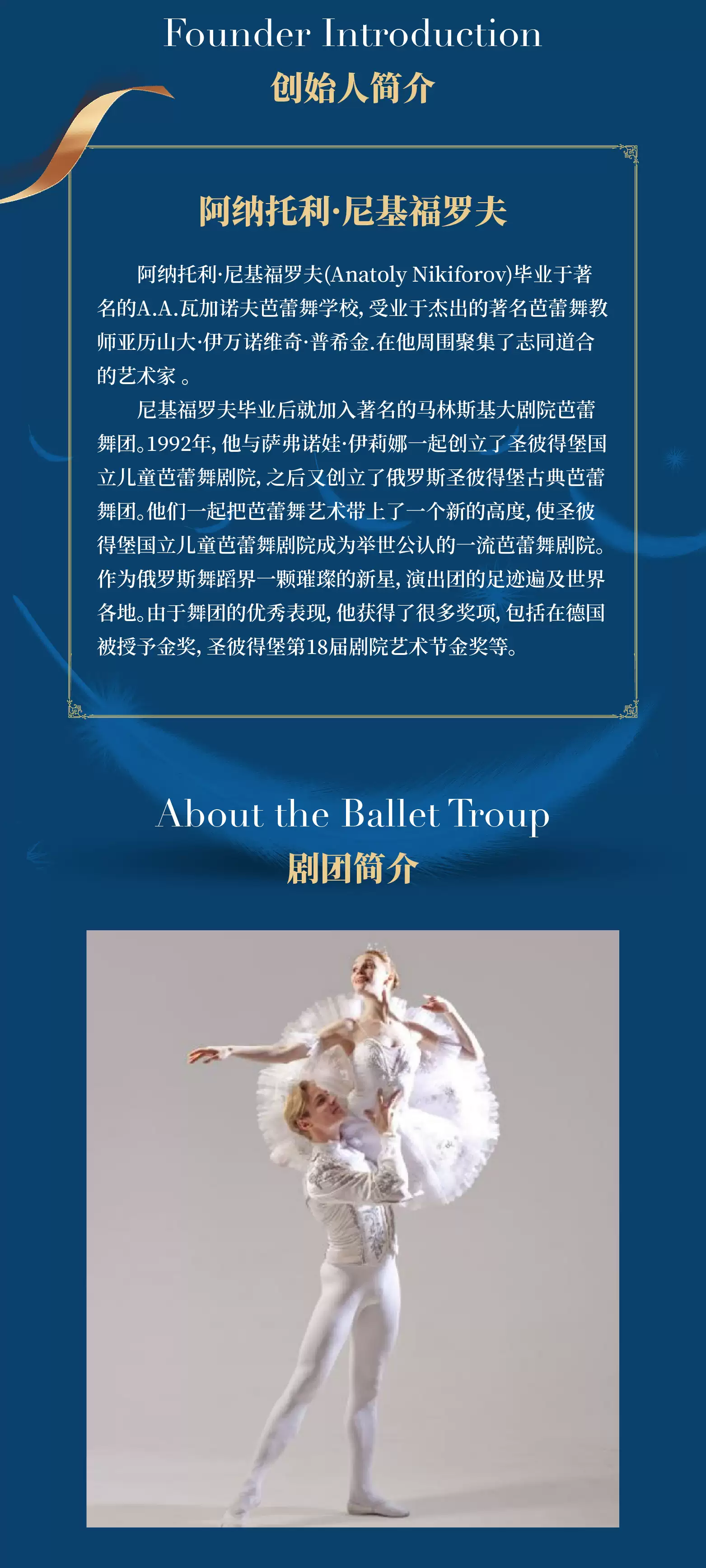 俄罗斯圣彼得堡明星芭蕾舞团由著名的芭蕾舞演员尼古拉·博依奇科夫以及众多俄罗斯圣彼得堡著名芭蕾舞艺术家、俄罗斯国家最高艺术奖获得者和黄金索菲亚奖获得者参与组建。该团保留了俄罗斯芭蕾舞历史的重要传统,体现了高度的表现艺术和芭蕾舞技巧,舞蹈团一贯致力于复兴优秀的俄罗斯芭蕾剧目,将观众带入极富个性色彩的俄罗斯芭蕾舞蹈家的创作世界。