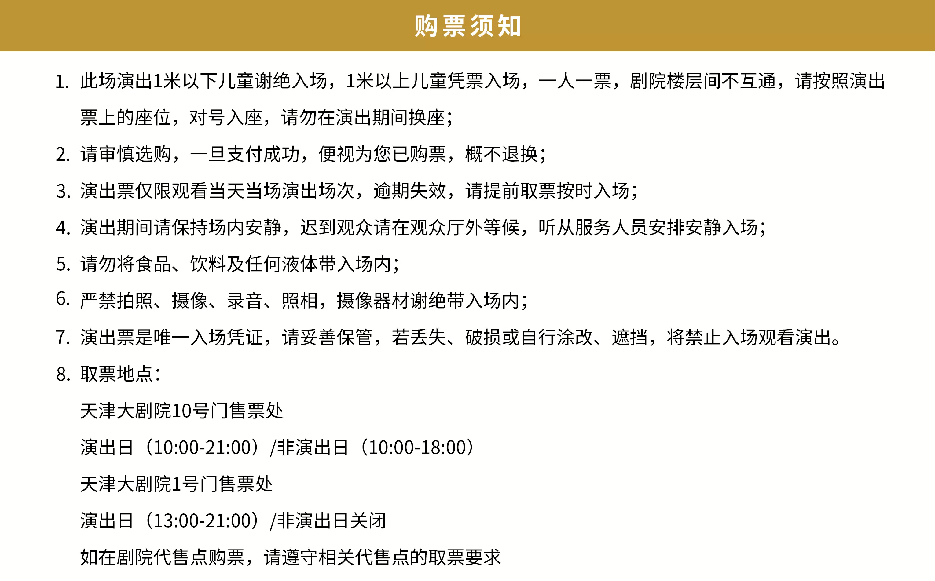 1.购买前请您提前规划好行程,做好相应准备,以免影响您的正常观演,感谢您的理解和配合。