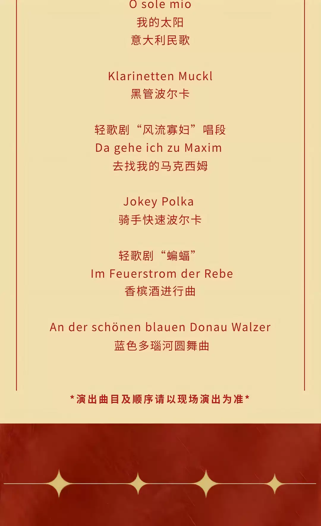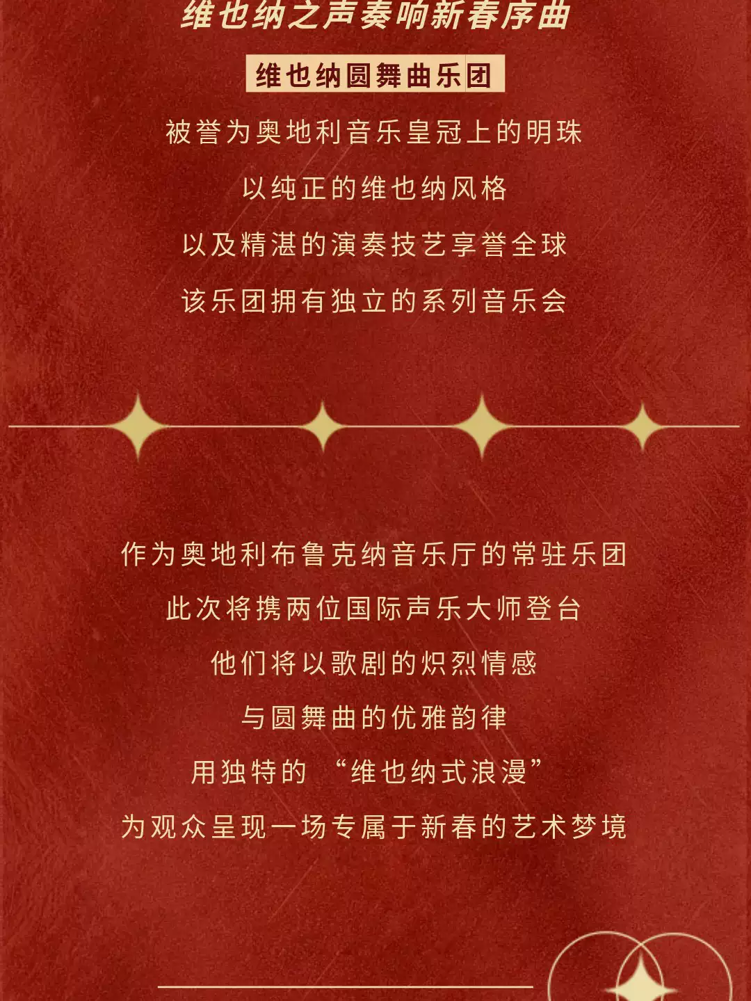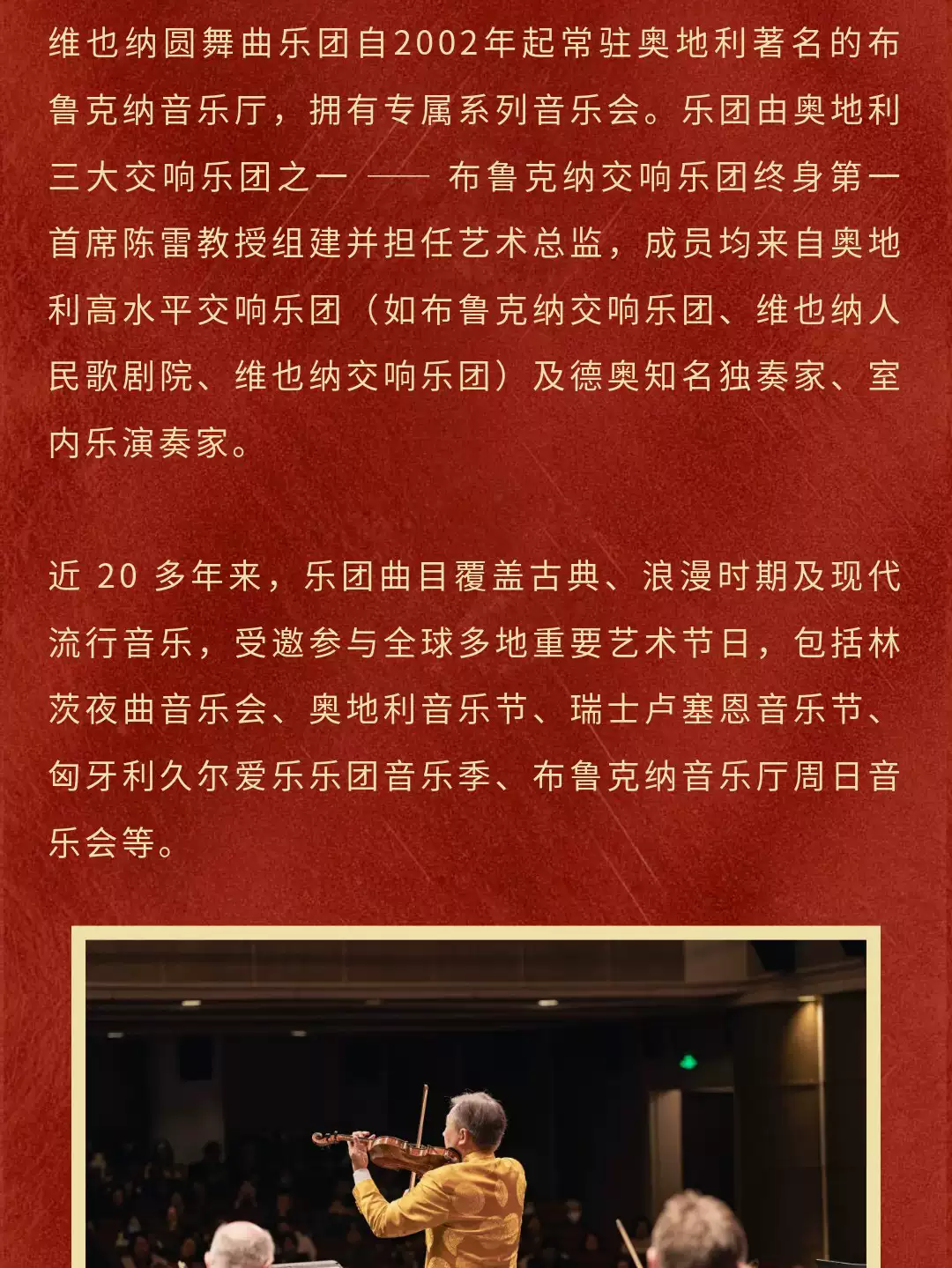 据悉,在本次维也纳圆舞曲乐团北京新春音乐会的演出现场,将精选众多约翰·施特劳斯家族的经典作品,从《蓝色多瑙河圆舞曲》的悠扬,到《皇帝圆舞曲》的华丽,每一曲都是对美好生活的颂歌,每一首都能让你的心灵在旋律中翩翩起舞!