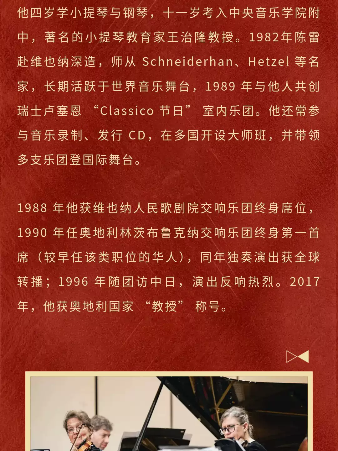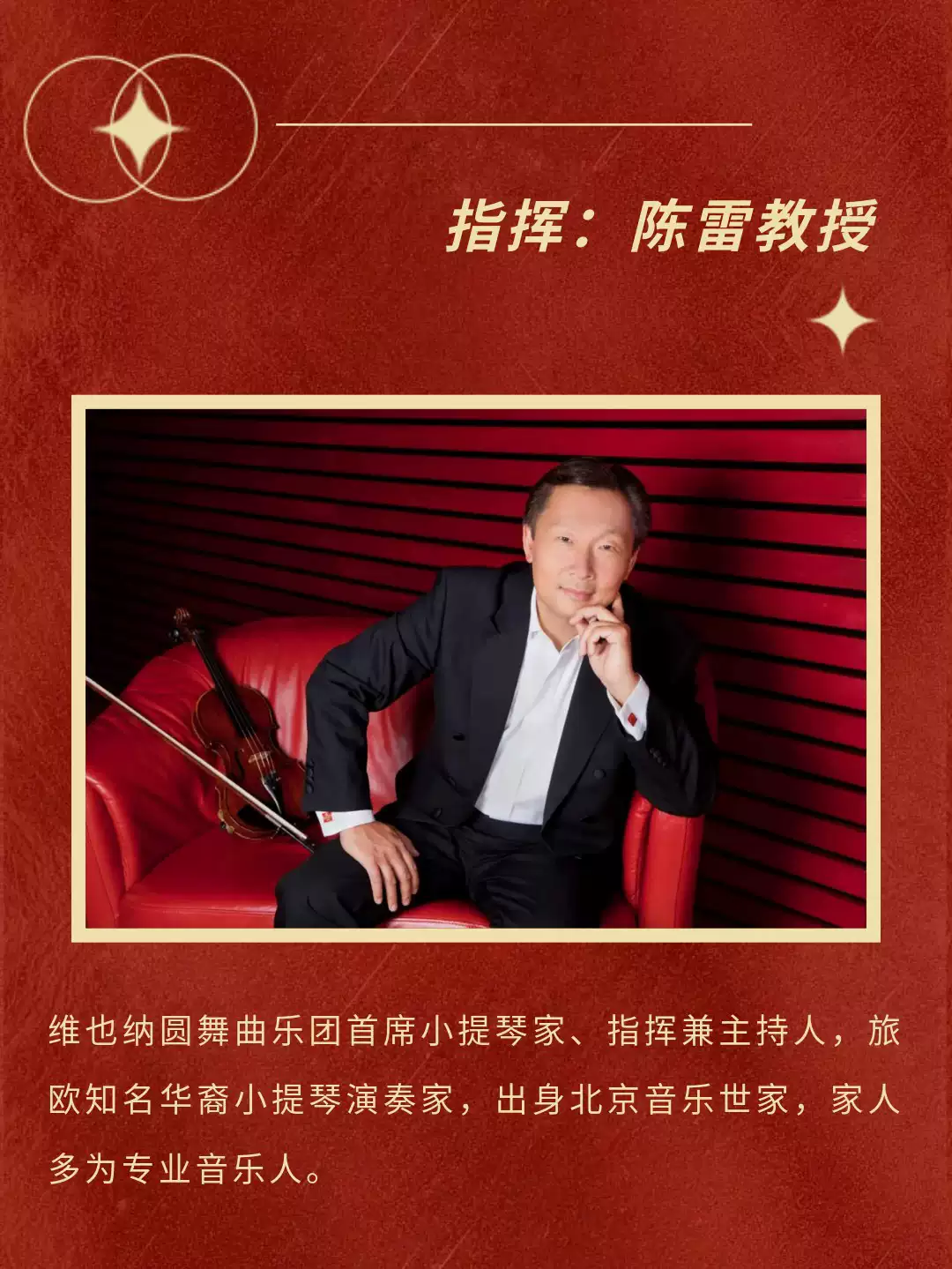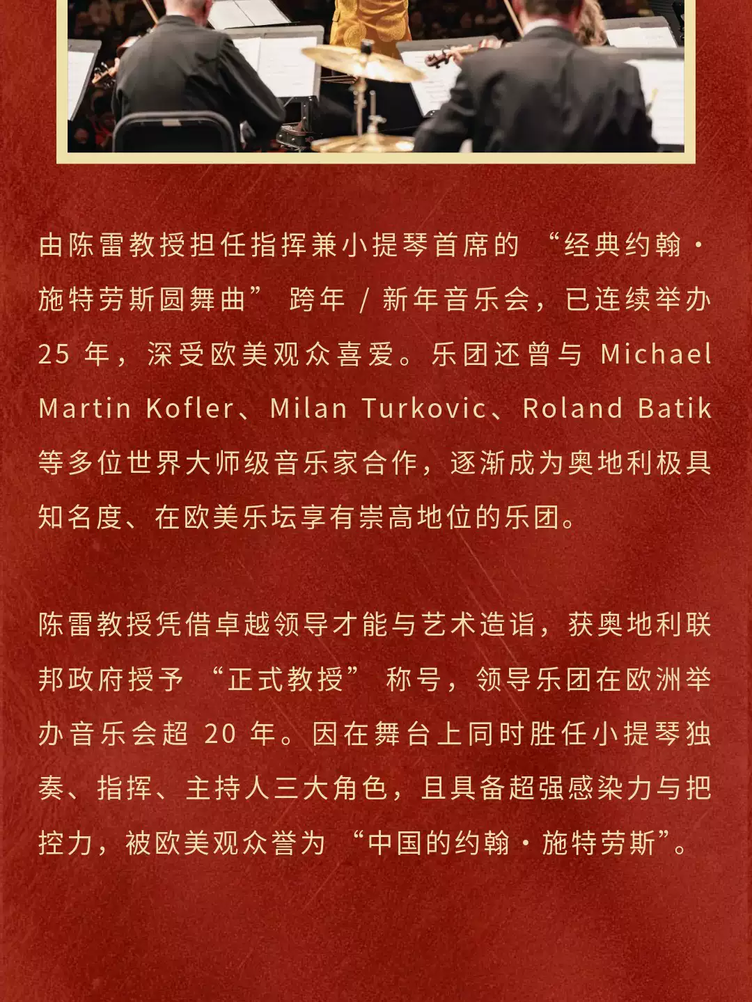 陈雷,约翰·施特劳斯圆舞曲乐团首席小提琴家,指挥兼主持人,旅欧著名华裔小提琴演奏家。作为独奏和室内乐演奏家,陈雷教授长期活跃于世界音乐舞台,他的演奏享誉国际乐坛,被欧美观众美称为“中国的约翰.施特劳斯”,深受广大听众的欢迎!