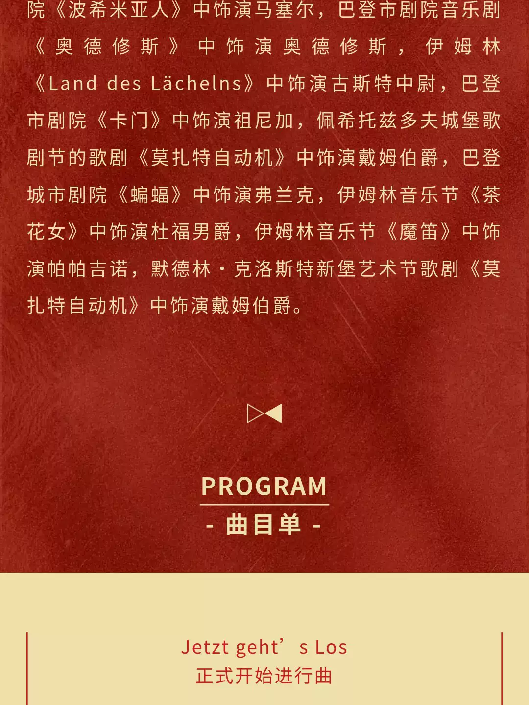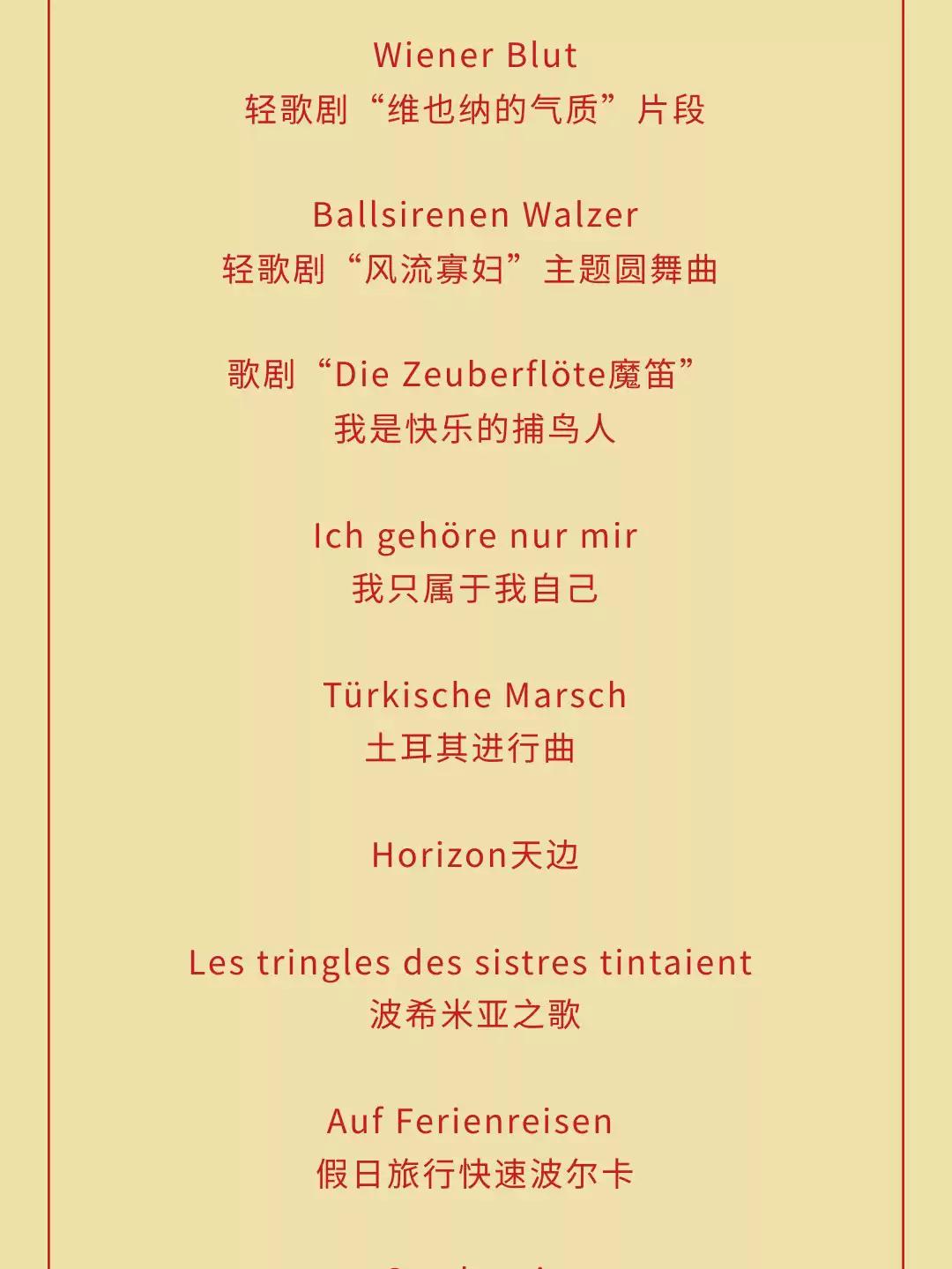 届时,卓越传承的奥地利音乐瑰宝、浪漫氛围满满的施特劳斯名曲、引领音乐之旅的国际指挥大师、演绎世界经典的顶尖乐手、歌声婉转动人如诗的歌唱家将联手献上一场音乐盛会,期待各位的到来哦!