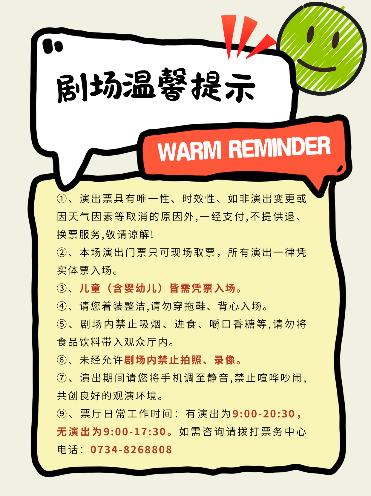 3.迟到观众需在场外等候,听从工作人员安排进场。请您合理安排出行时间,尽量提前抵达剧院,以免延误观演。