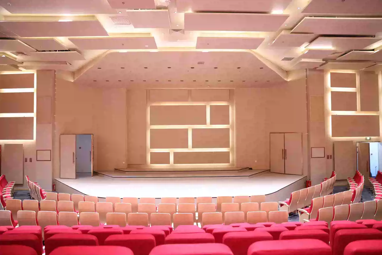 梦幻浪漫的复古红色的观众席与方形原木色的厅内装潢