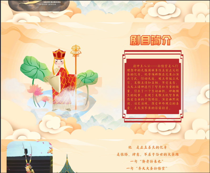 4月19日新国潮奇幻儿童剧《孙悟空--大闹天宫》在菏泽大剧院上演,将头戴凤翅紫金冠,身穿黄金锁子甲,脚踏藕丝步云履,手拿如意金箍棒,齐天大圣孙悟空的故事带进剧场,齐天大圣以全新的姿态重现舞台,带领大小朋友们一同重温那段激动人心的传奇故事,一起期待吧!