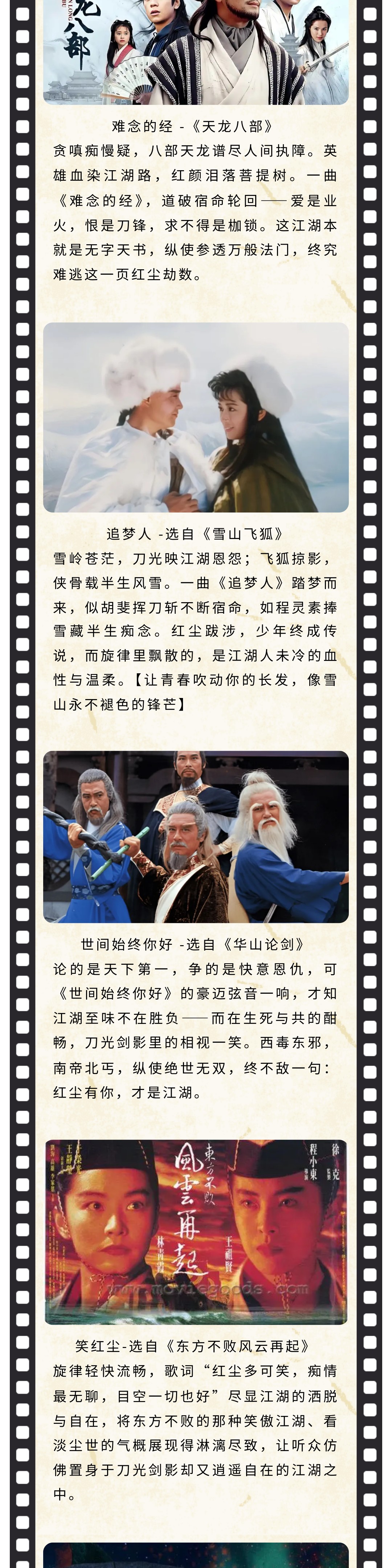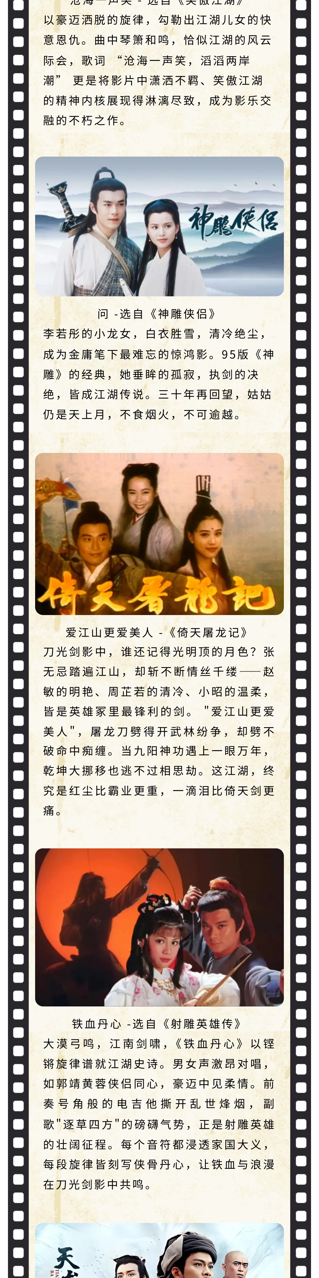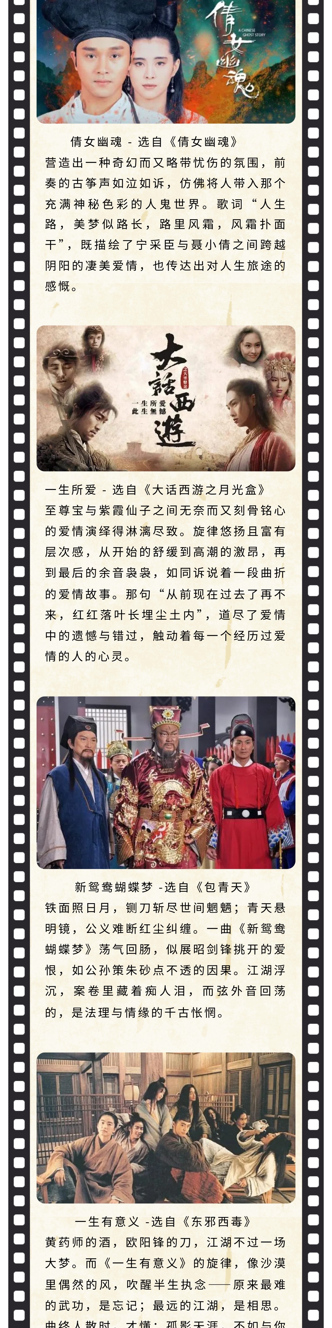 经典,是《男儿当自强》中激励着无数人在困境中奋勇拼搏;是《滚滚红尘》中道尽了人生的悲欢离合,触动着每一个人内心深处对情感的珍视与惋惜;是《天若有情》中对纯真爱情的向往与感动;是《倩女幽魂》中宁采臣与聂小倩之间跨越阴阳的凄美爱情;也是《夕阳之歌》中如同夕阳西下余晖般的英雄迟暮...