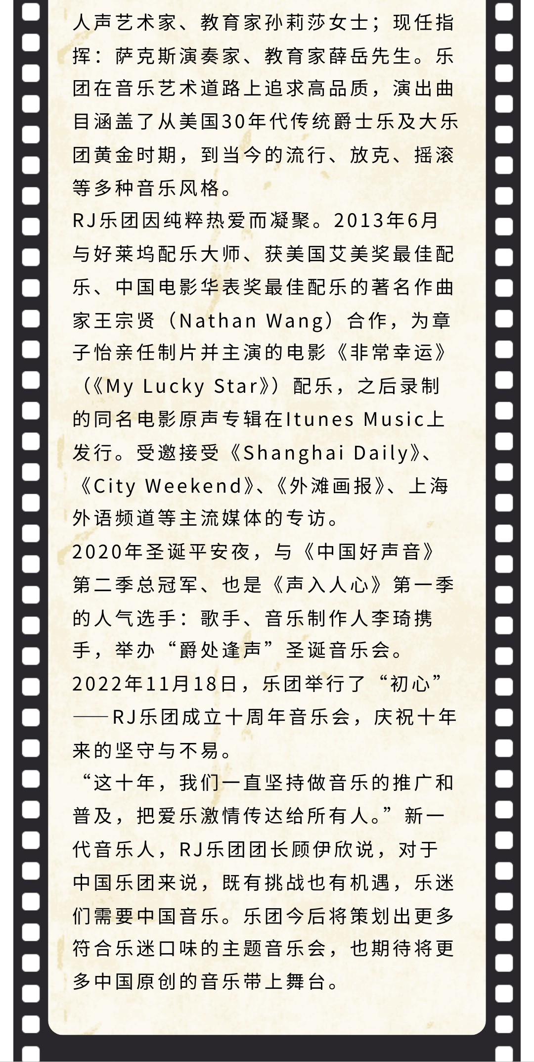 RJ乐团因纯粹热爱而凝聚。2013年6月与好莱坞配乐大师、获美国艾美奖最佳配乐、中国电影华表奖最佳配乐的著名作曲家王宗贤(Nathan Wang)合作,为章子怡亲任制片并主演的电影《非常幸运》(《My Lucky Star》)配乐,之后录制的同名电影原声专辑在Itunes Music上发行。受邀接受《Shanghai Daily》、《City Weekend》、《外滩画报》、上海外语频道等主流媒体的专访。