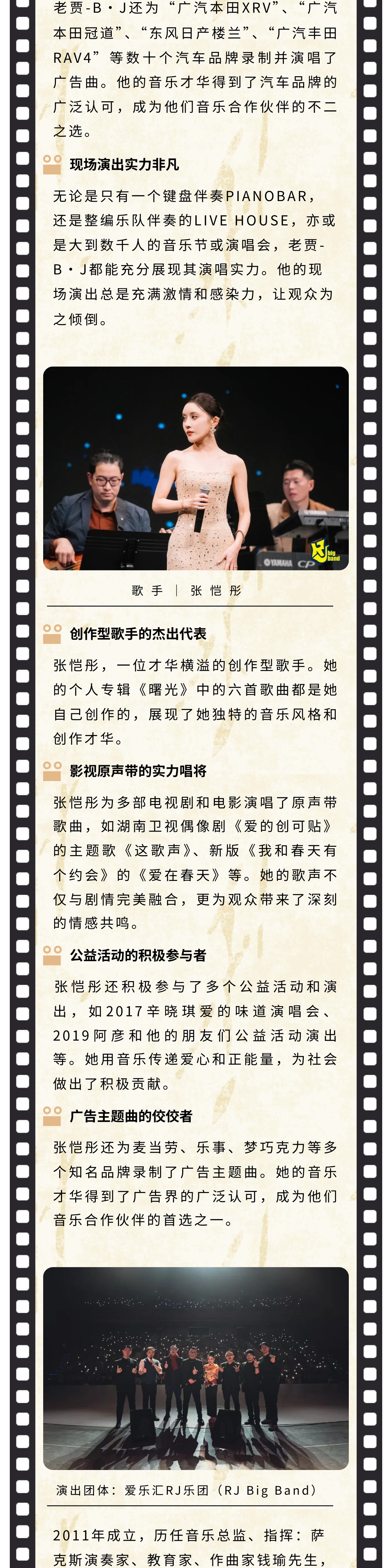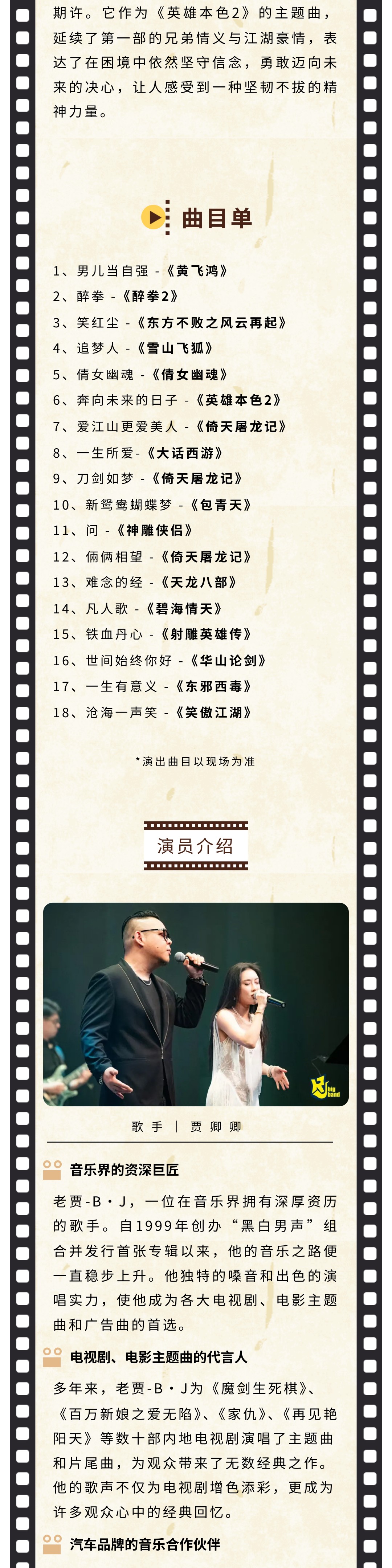 在本次演唱会中,歌手老贾-B·J 与张恺彤携手RJ乐团精心挑选了一系列脍炙人口的电影金曲,每一首歌曲都是一个时代的记忆,一场不容错过的音乐之旅,带你重回那些经典影视的辉煌岁月,一同沉浸在这港台影视金曲的海洋中,感受岁月的魅力与音乐的力量。