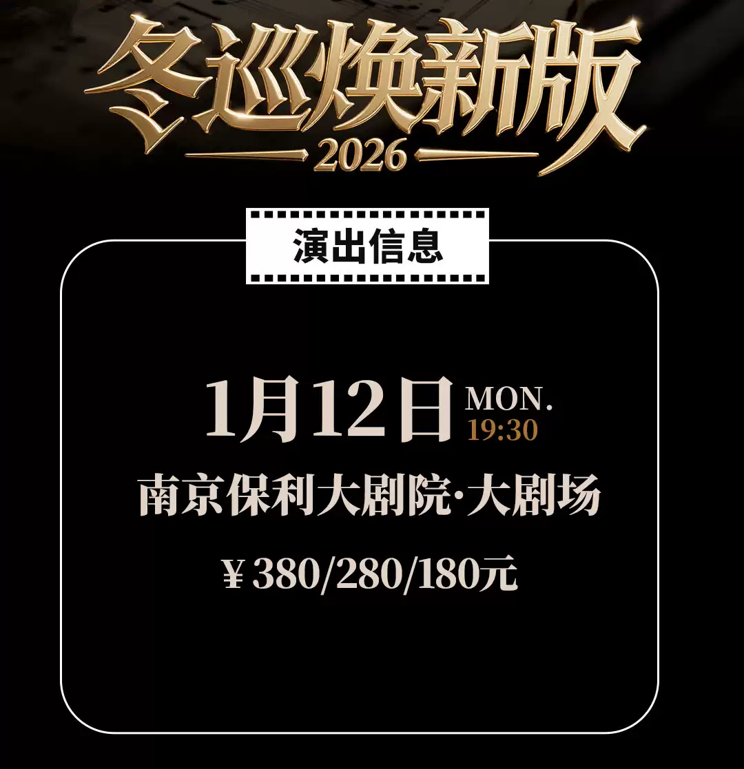演出时间 2026-01-12 周一 19:30 演出场馆 南京保利大剧院 演出时长 以现场为准 儿童入场提示 儿童一律凭成人票入场 演出详情
