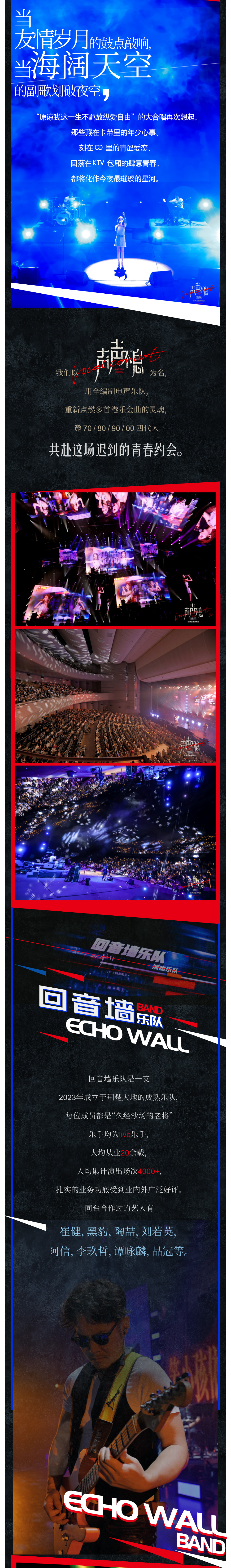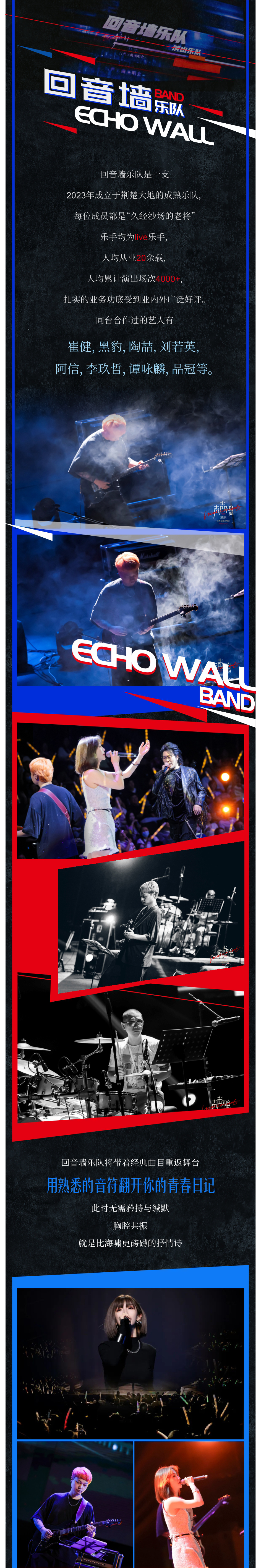 回音墙乐队是一只2024年成立于荆楚大地的成熟乐队,每位成员都是“久经沙场的老将”乐手均为live乐手,人均从业20余载,人均累计演出场次4000+,扎实的业务功底受到业内外广泛好评。