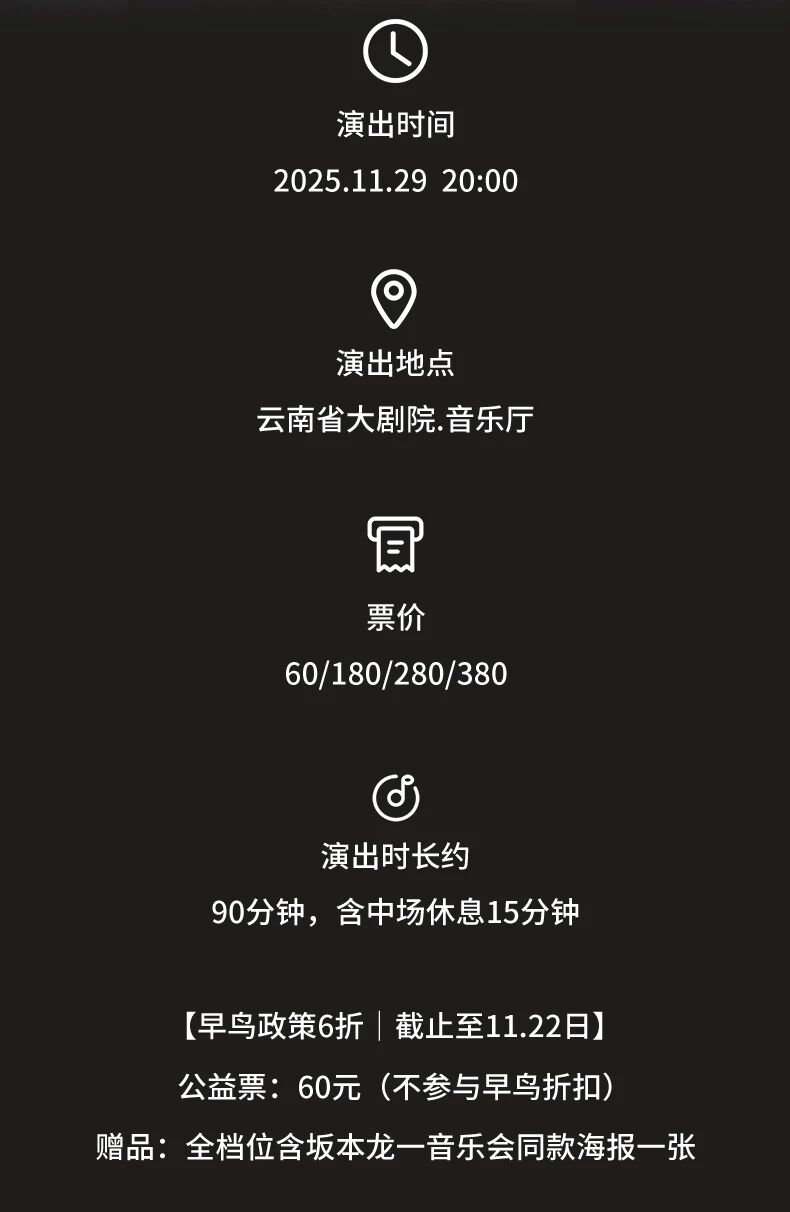 演出时间 2025-11-29 星期六 20:00 演出场馆 云南省大剧院 演出时长 以现场为准 儿童入场提示 儿童一律凭成人票入场 演出详情
